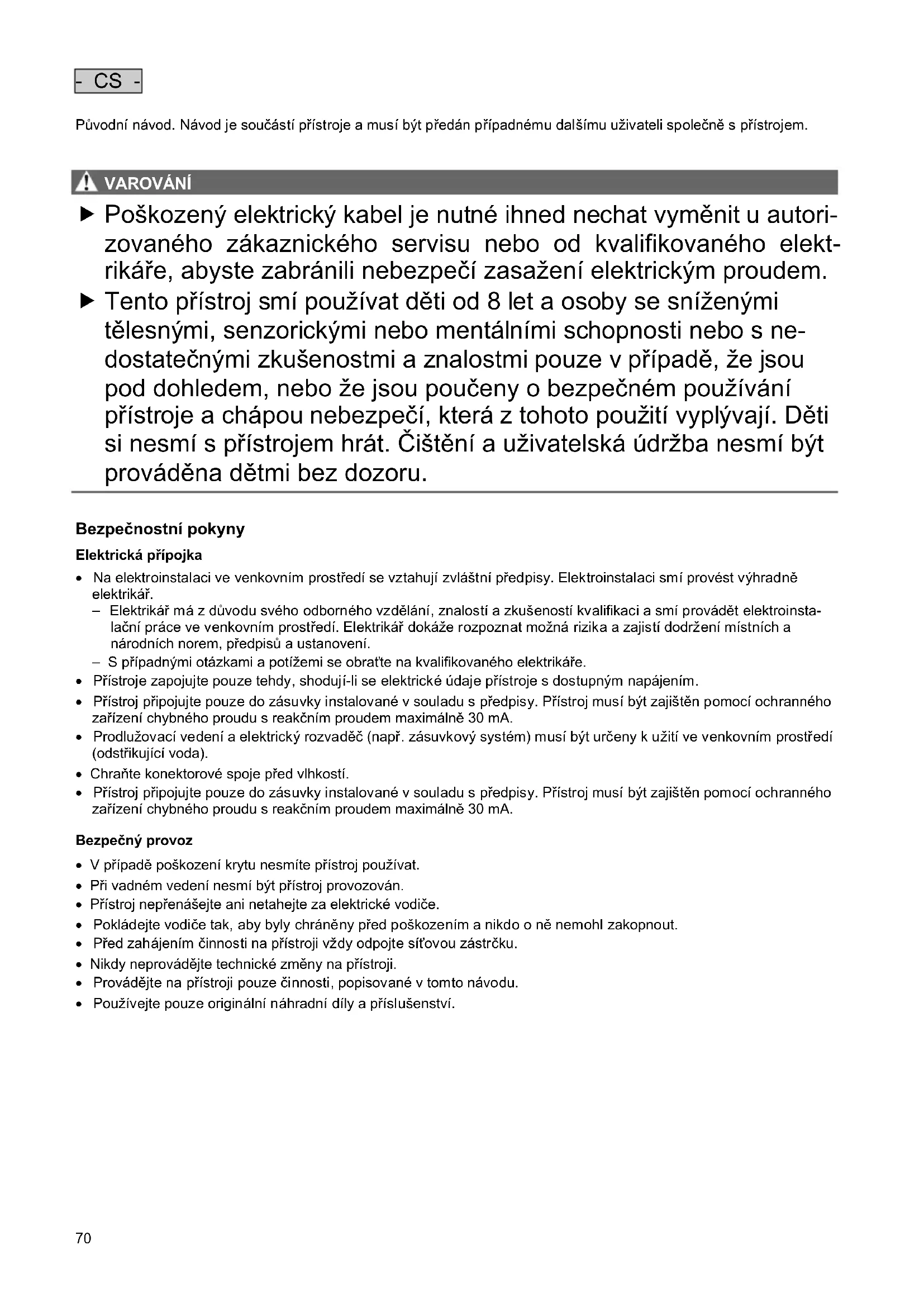 VAROV ÁNÍ VAROVÁNÍ Poškozený elektrický kabel je nutné ihned nechat vyměnit u autori- zovaného zákaznického servisu nebo od kvalifikovaného elekt- rikáře, abyste zabránili nebezpečí zasažení elektrickým proudem. Tento přístroj smí používat děti od 8 let a osoby se sníženými tělesnými, senzorickými nebo mentálními schopnosti nebo s ne- dostatečnými zkušenostmi a znalostmi pouze v případě, že jsou pod dohledem, nebo že jsou poučeny o bezpečném používání přístroje a chápou nebezpečí, která z tohoto použití vyplývají. Děti si nesmí s přístrojem hrát. Čištění a uživatelská údržba nesmí být prováděna dětmi bez dozoru.