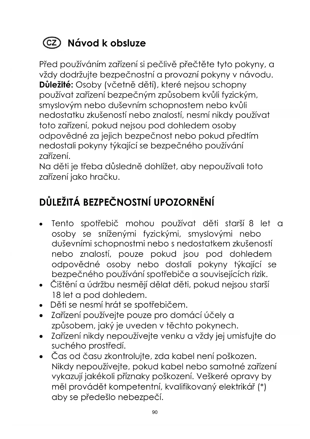Tento spotřebič mohou používat děti starší 8 let a osoby se sníženými fyzickými, smyslovými nebo duševními schopnostmi nebo s nedostatkem zkušeností nebo znalostí, pouze pokud jsou pod dohledem odpovědné osoby nebo dostali pokyny týkající se bezpečného používání spotřebiče a souvisejících rizik. Čištění a údržbu nesmějí dělat děti, pokud nejsou starší 18 let a pod dohledem. Děti se nesmí hrát se spotřebičem. Zařízení používejte pouze pro domácí účely a způsobem, jaký je uveden v těchto pokynech. Zařízení nikdy nepoužívejte venku a vždy jej umisťujte do suchého prostředí. Čas od času zkontrolujte, zda kabel není poškozen. Nikdy nepoužívejte, pokud kabel nebo samotné zařízení vykazují jakékoli příznaky poškození. Veškeré opravy by měl provádět kompetentní, kvalifikovaný elektrikář (*) aby se předešlo nebezpečí.