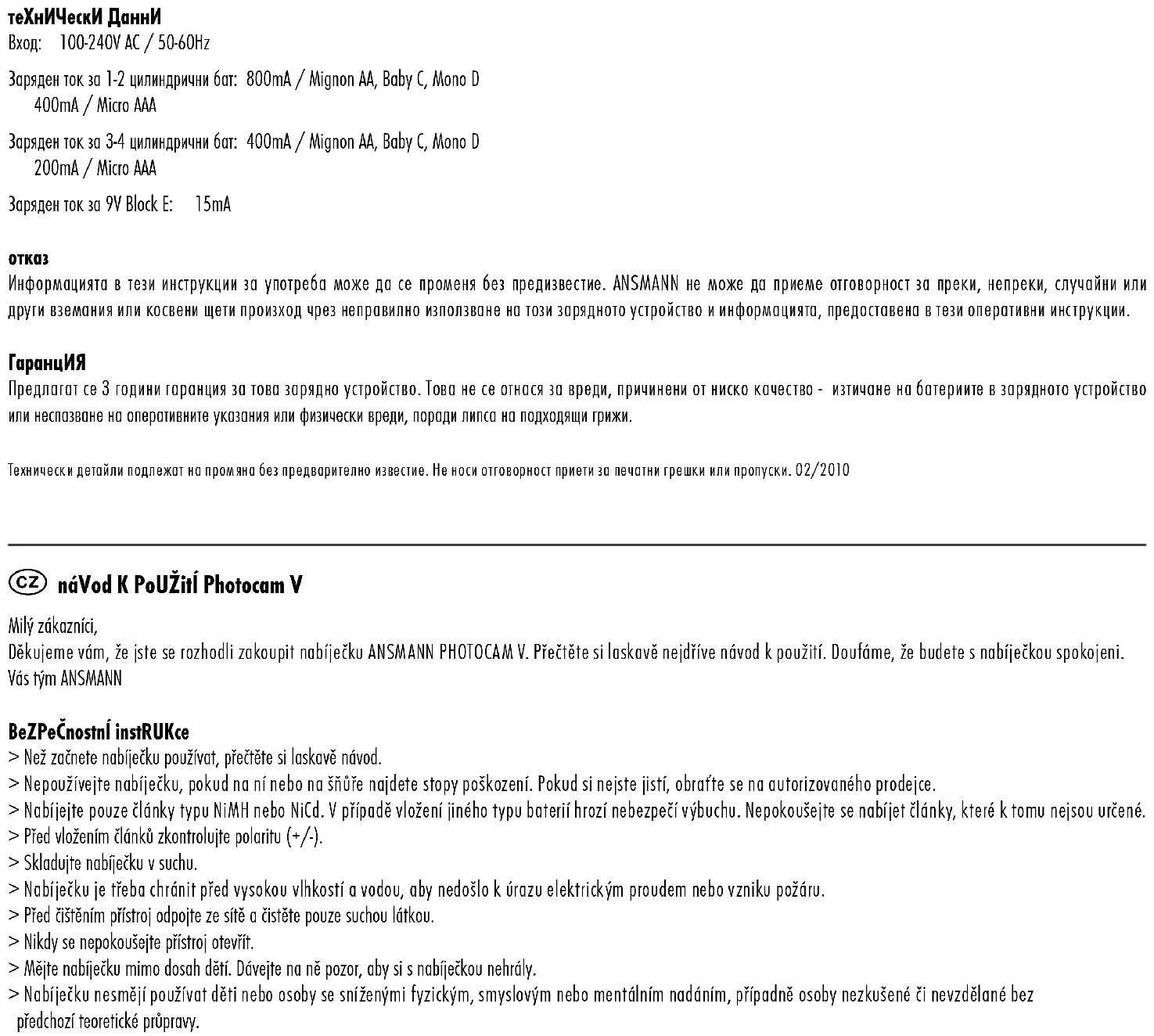 > Inteligentní nabíječka na 1 až 4 dobíjecí akumulátory typu NiMH nebo NiCd o velikosti Micro (AAA), Mignon (AA), Baby (C), Mono (D) a jeden článek typu 9V Block (E) > Diodová signalizace nabíjení > Nabíjení každého článku zvlášť > Ochrana před přepólováním > Možnost využití kdekoliv na světě (100-240 V AC / 50-60 Hz) U válcových článků: > Rychlá zkouška kapacity přibližně 5 vteřin po vložení článků > Nabíjení řízené mikroprocesorem > Automatická regulace proudu při nabíjení > Vícenásobná ochrana před přebitím > Kapkové nabíjení > Detekce vadných článků / detekce vložení alkalických článků PROVOZ Připojte nabíječku do elektrické sítě (100-240 V AC / 50 - 60Hz). 1. Nabíjení válcových článků: nabíjet lze dobíjecí akumulátory typu NiMH nebo NiCd o velikosti Micro (AAA), Mignon (AA), Baby (C), Mono (D). Před vložením článku odsuňte posuvný kontakt směrem vzad a vložte na dno dobíjecího slotu dobíjecí baterii. Baterie zapojujte zásadně se správnou polaritou podle symbolů v dobíjecím slotu. Bezprostředně po vložení článku nabíječka změří její kapacitu a ukáže výsledek přibližně na 5 vteřin prostřednictvím diody vedle daného slotu (viz RYCHLÁ ZKOUŠKA KAPACITY U KULATÝCH ČLÁNKŮ). Poté se automaticky zahájí nabíjení. Stav dobití článků před nabíjením nehraje roli. Aktuální stav článku se ukazuje prostřednictvím diody nad daným slotem (viz INDIKÁTOR STAVU DOBITÍ VÁLCOVÝCH ČLÁNKŮ). Články není třeba vkládat zároveň, neboť jsou jednotlivé procesy nabíjení na sobě nezávislé. Články se při nabíjení běžně zahřívají. Po skončení nabíjení se nabíječka automaticky uvede do režimu „kapkového nabíjení“. 2. Nabíjení 9V baterie: Přístroj umožňuje nabíjení jednoho článku typu 9V Block (E) v případě, že nejsou vložené vlevo ani vpravo od tohoto slotu žádné články typu Mono (D). Při vkládání 9V baterie zkontrolujte polaritu podle symbolů ve slotu. Po správném vložení baterie se rozsvítí červená dioda nad dobíjecím slotem. Nabíjejte prosím pouze vybité baterie, předejdete tak jejich přebití. Dobu nabíjení na 100 mAh si vyhledejte v tabulce [1] a po uplynutí patřičné doby 9V baterii z dobíjecího slotu vyjměte. RYCHLÁ ZKOUŠKA KAPACITY U VÁLCOVÝCH ČLÁNKŮ (indikace cca 5 vteřin) dioda svítí zeleně: baterie je téměř plně nabitá, nabíjení není zapotřebí dioda bliká zeleně: baterie má přijatelnou kapacitu, ale nabíjení se doporučuje dioda svítí červeně: baterie má malou kapacitu, nabíjení je třeba dioda bliká červeně: baterie je zcela vybitá, nabíjení je nutné INDIKÁTOR STAVU DOBITÍ U VÁLCOVÝCH ČLÁNKŮ dioda svítí červeně: rychlé nabíjenídioda svítí zeleně: hotovo / kapkové nabíjení dioda bliká červeně: vadný článek nebo nebyla vložena dobíjecí baterie indiKátoR staVU doBití U ČLánKU 9V BLocK (e) dioda svítí červeně: nabíjení eKoLogicKá doPoRUČení Nabíječku nevyhazujte do běžného domácího odpadu. Odneste ji laskavě prodejci nebo do nejbližšího sběrného dvora. Veškeré obaly laskavě recyklujte, šetříte tím přírodu. Baterie se nesmějí vyhazovat do běžného domácího odpadu. Odevzdejte je na sběrném místě nebo v příslušném obchodě. ÚdRžBa Aby nabíječka fungovala, jak má, chraňte dobíjecí sloty před prachem a špínou. Před čištěním odpojte nabíječku z elektrické sítě nebo elektrického obvodu auta a otřete ji suchou látkou. technicKÉ ÚdaJe Napětí: 100-240 V AC / 50-60 Hz Nabíjecí proud pro 1-2 válcové články: 800 mA / Mignon AA, Baby C, Mono D 400 mA / Micro AAA Nabíjecí proud pro 3-4 válcové články: 400 mA / Mignon AA, Baby C, Mono D 200 mA / Micro AAA Nabíjecí proud pro 9 V Block E: 15 mA PRohLáŠení Informace v tomto návodu se mohou bez ohlášení měnit. ANSMANN nenese zodpovědnost za přímé či nepřímé následky a škody způsobené používáním této nabíječky na základě informací zde uvedených. ZáRUKa Na tuto nabíječku se vztahuje záruka 3 roky. Ta se nevztahuje na poškození vzniklé následkem vytečení nekvalitních baterií do nabíječky ani na použití v rozporu s návodem, případně fyzické poškození následkem bezohledného zacházení. Technické údaje se mohou měnit bez předchozího ohlášení. Za typografické chyby neneseme zodpovědnost. 02/2010 BRUGSANVISNING Kære Kunde, Tak fordi du valgte at købe ANSMANN PHOTOCAM V oplader. Læs venligst brugsanvisningen grundigt inden anvendelse. Vi håber at du bliver glad for din nye oplader.