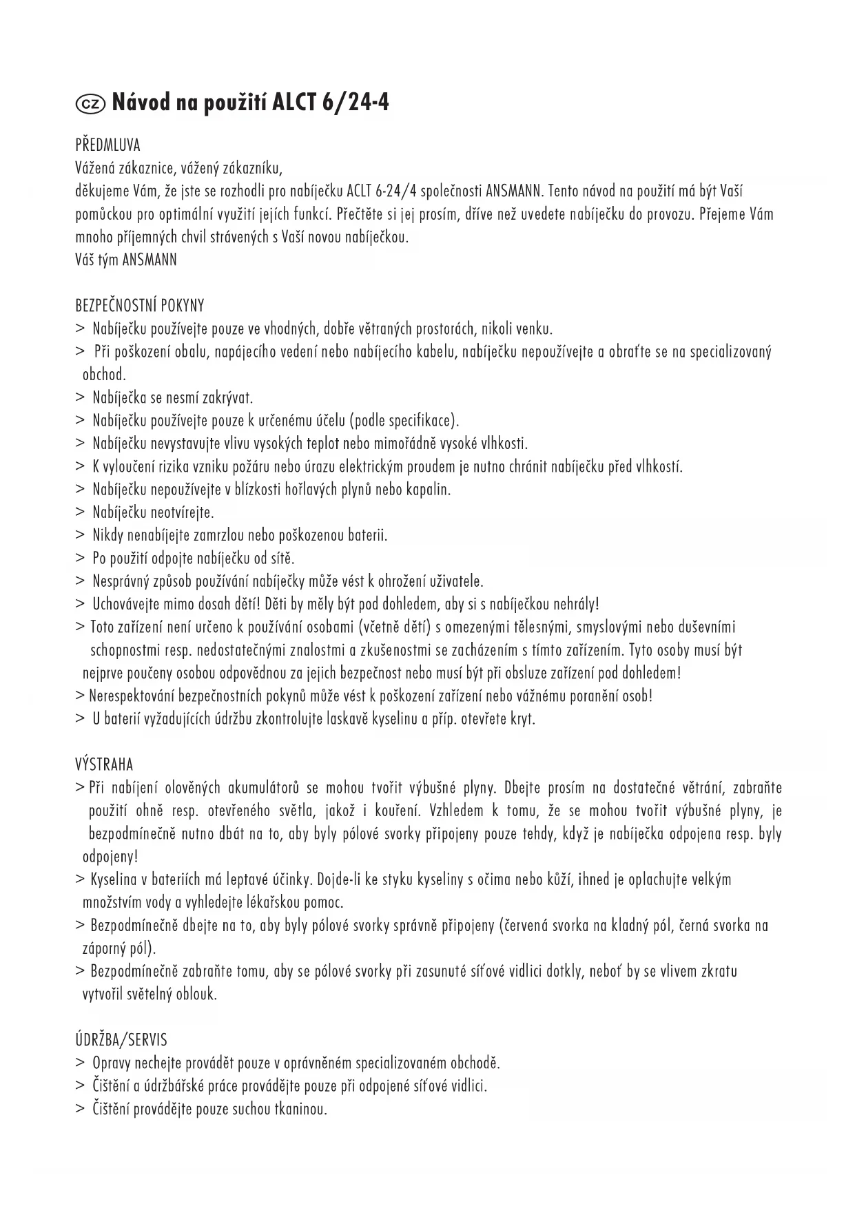 ANSMANN accorde une garantie de 3 ans sur ce produit. La garantie ne s’applique pas sur les dommages du chargeur liés à un non-respect des instructions. Les informations sont sujettes au changement sans préavis. ANSMANN n’est pas responsable de toute erreur d’impression. 06/2014 Návod na použití ALCT 6/24-4 PŘEDMLUVA Vážená zákaznice, vážený zákazníku, děkujeme Vám, že jste se rozhodli pro nabíječku ACLT 6-24/4 společnosti ANSMANN. Tento návod na použití má být Vaší pomůckou pro optimální využití jejích funkcí. Přečtěte si jej prosím, dříve než uvedete nabíječku do provozu. Přejeme Vám mnoho příjemných chvil strávených s Vaší novou nabíječkou. Váš tým ANSMANN