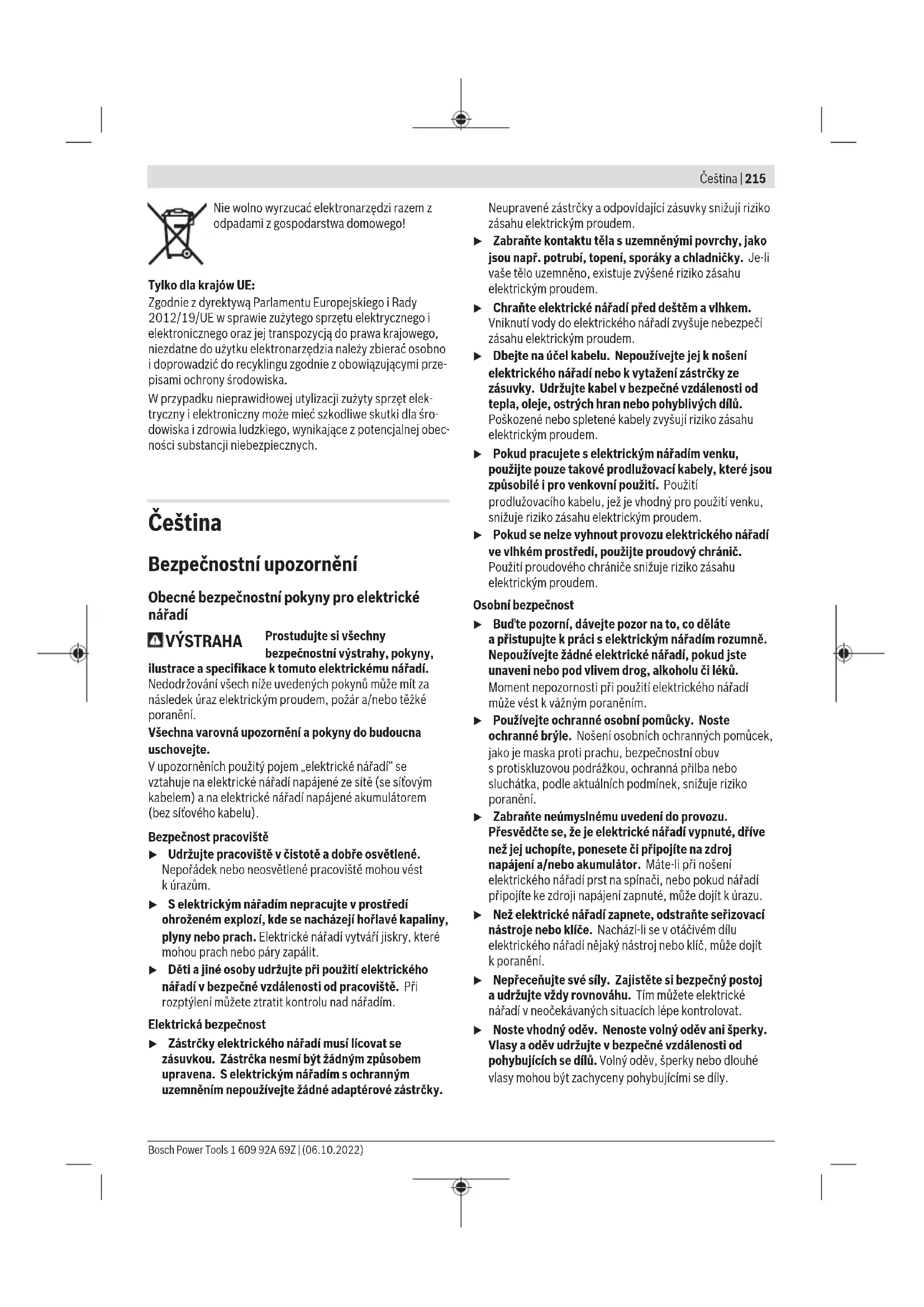 Uvedené hodnoty stupně otáček jsou orientační hodnoty. Bosch Power Tools 1 609 92A 69Z | (06.10.2022)224 | Čeština Montáž Montáž ochranného zařízení u Před každou prací na elektronářadí vytáhněte zástrčku ze zásuvky. Upozornění: Po prasknutí brusného kotouče během provozu nebo při poškození upínacích přípravků na ochranném krytu/ na elektronářadí se musí elektronářadí neprodleně zaslat zákaznickému servisu, adresy viz část „Zákaznická aporadenská služba“. Ochranný kryt pro broušení Nasaďte ochranný kryt (11) pro upínání na elektronářadí tak, aby kódovací výstupky ochranného krytu souhlasily supínáním. Stiskněte adržte přitom stisknutou odjišťovací páčku (1). Přitlačte ochranný kryt (11) na krk vřetena tak, aby nákružek ochranného krytu dosedal kpřírubě elektronářadí aotáčejte ochranným krytem, dokud slyšitelně nezaskočí. Nastavte polohu ochranného krytu (11) podle požadavků příslušné práce. Odjišťovací páčku (1) stiskněte nahoru aotočte ochranný kryt (11) do požadované polohy. u Ochranný kryt(11) nastavte vždy tak, aby oba výstupky odjišťovací páčky (1) zapadly do příslušných otvorů vochranném krytu (11). u Ochranný kryt (11) nastavte tak, aby jiskry nelétaly směrem kpracovníkovi. u Ochranným krytem (11) smí být možné otáčet pouze po stisknutí odjišťovací páčky (1)! Vopačném případě se nesmí elektronářadí vžádném případě nadále používat amusí se dát do servisu. Upozornění: Kódovací výstupky na ochranném krytu (11) zabezpečují, že lze namontovat pouze ochranný kryt, který je vhodný pro toto elektronářadí. Odsávací kryt pro broušení Pro bezprašné broušení barev, laků aplastů ve spojení stvrdokovovými hrncovými kotouči(15) můžete použít odsávací kryt(10). Odsávací kryt(10) není vhodný pro broušení kovu. Kodsávacímu krytu(10) lze připojit vhodný vysavač Bosch. Za tímto účelem nasaďte sací hadici sodsávacím adaptérem do příslušného hrdla odsávacího krytu. Ochranný kryt pro dělení u Při dělení používejte vždy ochranný kryt pro dělení(12) nebo ochranný kryt pro broušení (11) společně skrytem pro dělení (13). u Při dělení kamene zajistěte dostatečné odsávání prachu. Ochranný kryt pro dělení(12) se montuje stejně jako ochranný kryt pro broušení(11). Kryt pro dělení zkovu Namontujte kryt pro dělení(13) zkovu na ochranný kryt pro broušení(11) (viz obrázek A): Překlopte přídržný oblouk zpět (➊). Nasaďte kryt(13) na ochranný kryt pro broušení (11) (➋). Přídržný oblouk pevně přitlačte kochrannému krytu(11) (➌). Pro demontáž (viz obrázekB) stiskněte tlačítko na přídržném oblouku (➊) apřeklopte ho zpět (➋). Stáhněte kryt(13) zochranného krytu(11) (➌). Kryt pro dělení zplastu Nasaďte kryt pro dělení(13) zplastu na ochranný kryt pro broušení(11) (viz obrázekC). Kryt(13) slyšitelně aviditelně zaskočí na ochranném krytu(11). Pro demontáž (viz obrázekD) odjistěte kryt(13) na ochranném krytu(11) (➊) vlevo nebo vpravo astáhněte kryt