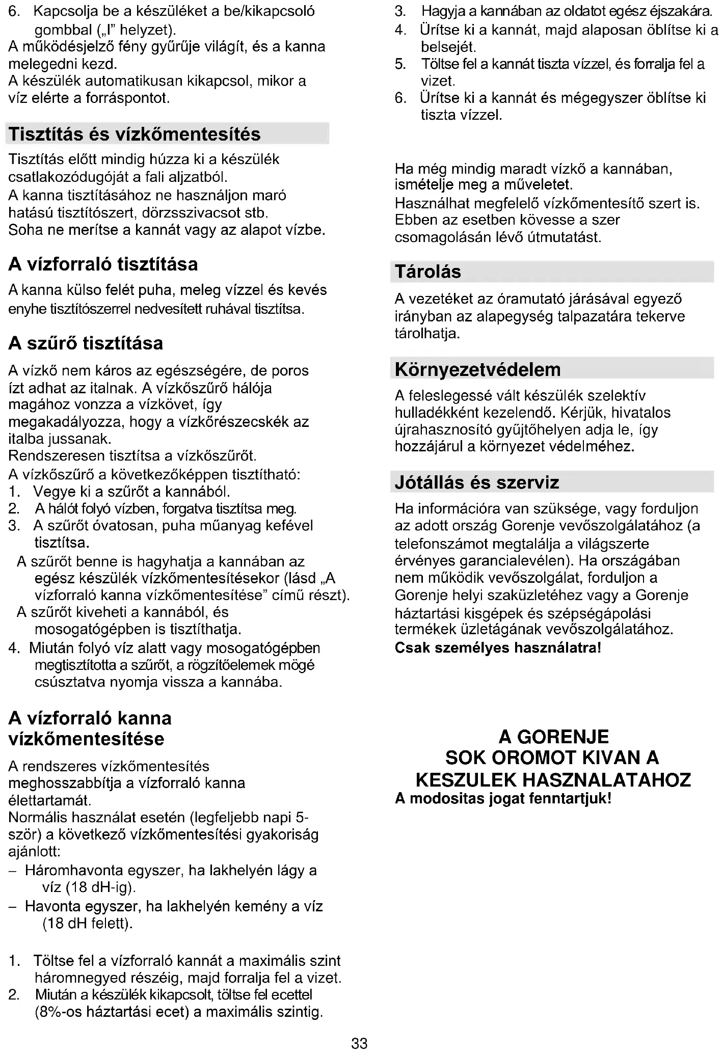 vodou. Pokud by byly v konvici ještě patrné zbytky vodního kamene, postup opakujte. Můžete též použít vhodný odstraňovač vodního kamene. V takovém případě se řiďte návodem na obalu odstraňovače. Skladování Napájecí kabel můžete snadno uložit tak, že budete otáčet navíječem kabelu v dolní části základny po směru hodinových ručiček. Životní prostředí Až přístroj doslouží, nevyhazujte jej do běžného komunálního odpadu, ale odevzdejte jej do sběrny určené pro recyklaci. Pomůžete tím chránit životní prostředí Záruka a servis Pokud byste měli jakýkoliv problém nebo byste potřebovali nějakou informaci, kontaktujte Středisko péče o zákazníky společnosti Gorenje ve své zemi (telefonní číslo střediska najdete v letáčku s celosvětovou zárukou). Pokud se ve vaší zemi Středisko péče o zákazníky nenachází, můžete kontaktovat místního dodavatele výrobků Gorenje nebo oddělení Service Department of Gorenje Domestic Appliances.