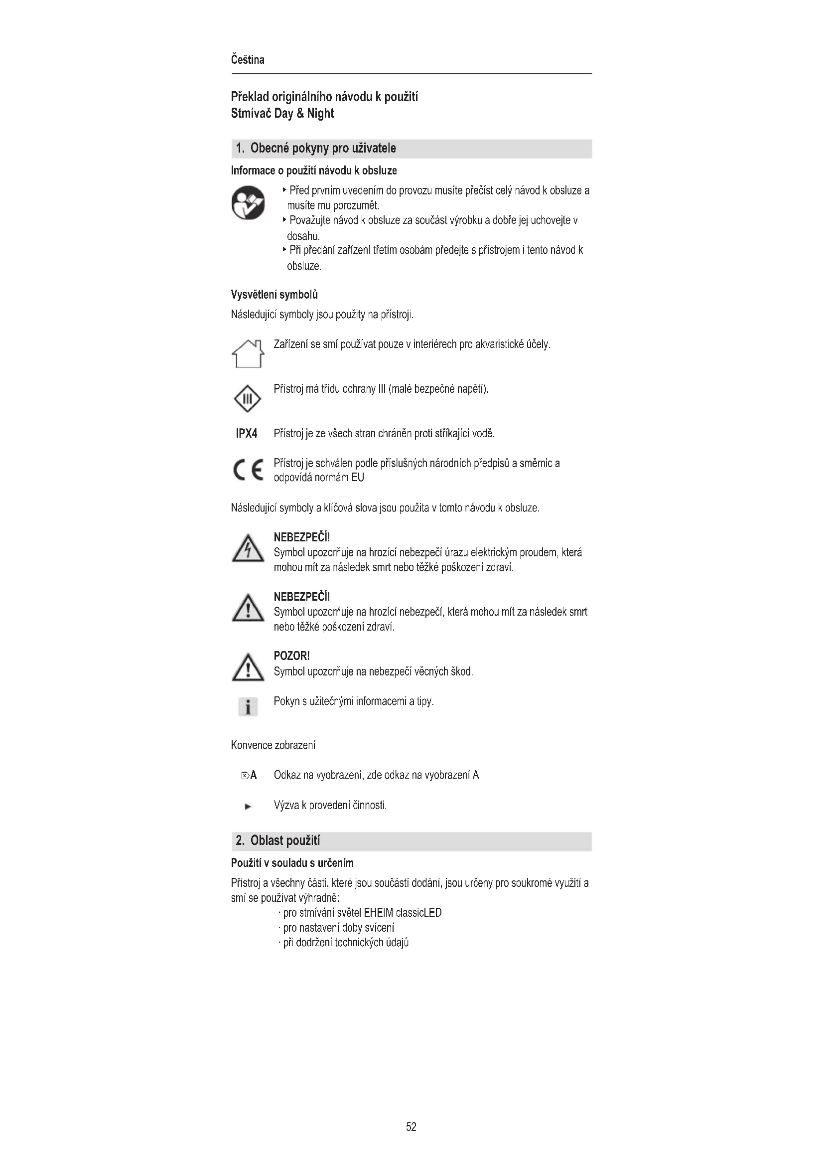 Použití v souladu s určením Přístroj a všechny části, které jsou součástí dodání, jsou určeny pro soukromé využití a smí se používat výhradně: ‧ pro stmívání světel EHEIM classicLED ‧ pro nastavení doby svícení ‧ při dodržení technických údajů IPX4 ⌦AČeština
