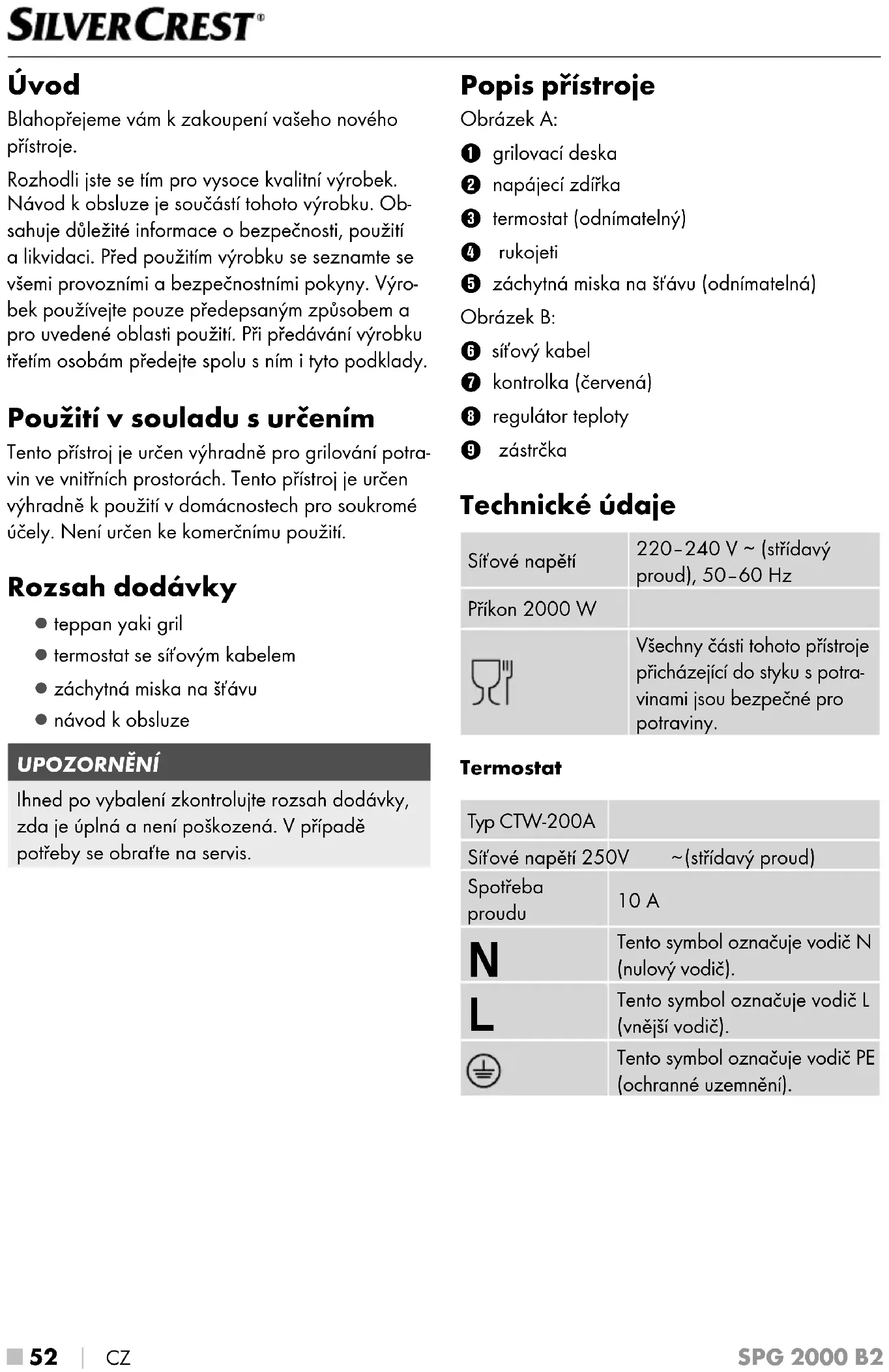 CZ SPG 2000 B2 Úvod Blahopřejeme vám kzakoupení vašeho nového přístroje. Rozhodli jste se tím pro vysoce kvalitní výrobek. Návod kobsluze je součástí tohoto výrobku. Ob- sahuje důležité informace obezpečnosti, použití a likvidaci. Před použitím výrobku se seznamte se všemi provozními a bezpečnostními pokyny. Výro- bek používejte pouze předepsaným způsobem a pro uvedené oblasti použití. Při předávání výrobku třetím osobám předejte spolu sním ityto podklady. Použití vsouladu surčením Tento přístroj je určen výhradně pro grilování potra- vin ve vnitřních prostorách. Tento přístroj je určen výhradně kpoužití vdomácnostech pro soukromé účely. Není určen ke komerčnímu použití. Rozsah dodávky ▯ teppan yaki gril ▯ termostat se síťovým kabelem ▯ záchytná miska na šťávu ▯ návod k obsluze UPOZORNĚNÍ Ihned po vybalení zkontrolujte rozsah dodávky, zda je úplná a není poškozená. Vpřípadě potřeby se obraťte na servis. Popis přístroje Obrázek A: 1 grilovací deska 2 napájecí zdířka 3 termostat (odnímatelný) 4 rukojeti 5 záchytná miska na šťávu (odnímatelná) Obrázek B: 6 síťový kabel 7 kontrolka (červená) 8 regulátor teploty 9 zástrčka Technické údaje Síťové napětí 220–240 V ∼ (střídavý proud), 50–60 Hz Příkon 2000 W Všechny části tohoto přístroje přicházející do styku s potra- vinami jsou bezpečné pro potraviny. Termostat Typ CTW-200A Síťové napětí 250 V
