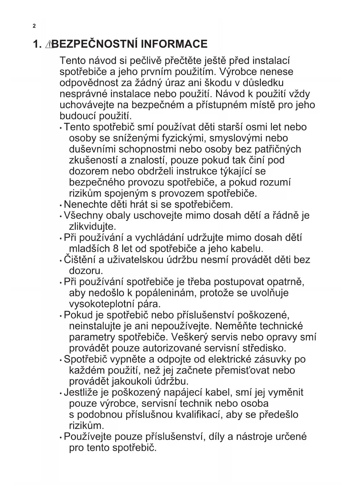 - Tento spotřebič smí používat děti starší osmi let nebo osoby se sníženými fyzickými, smyslovými nebo duševními schopnostmi nebo osoby bez patřičných zkušeností a znalostí, pouze pokud tak činí pod dozorem nebo obdrželi instrukce týkající se bezpečného provozu spotřebiče, a pokud rozumí rizikům spojeným s provozem spotřebiče.