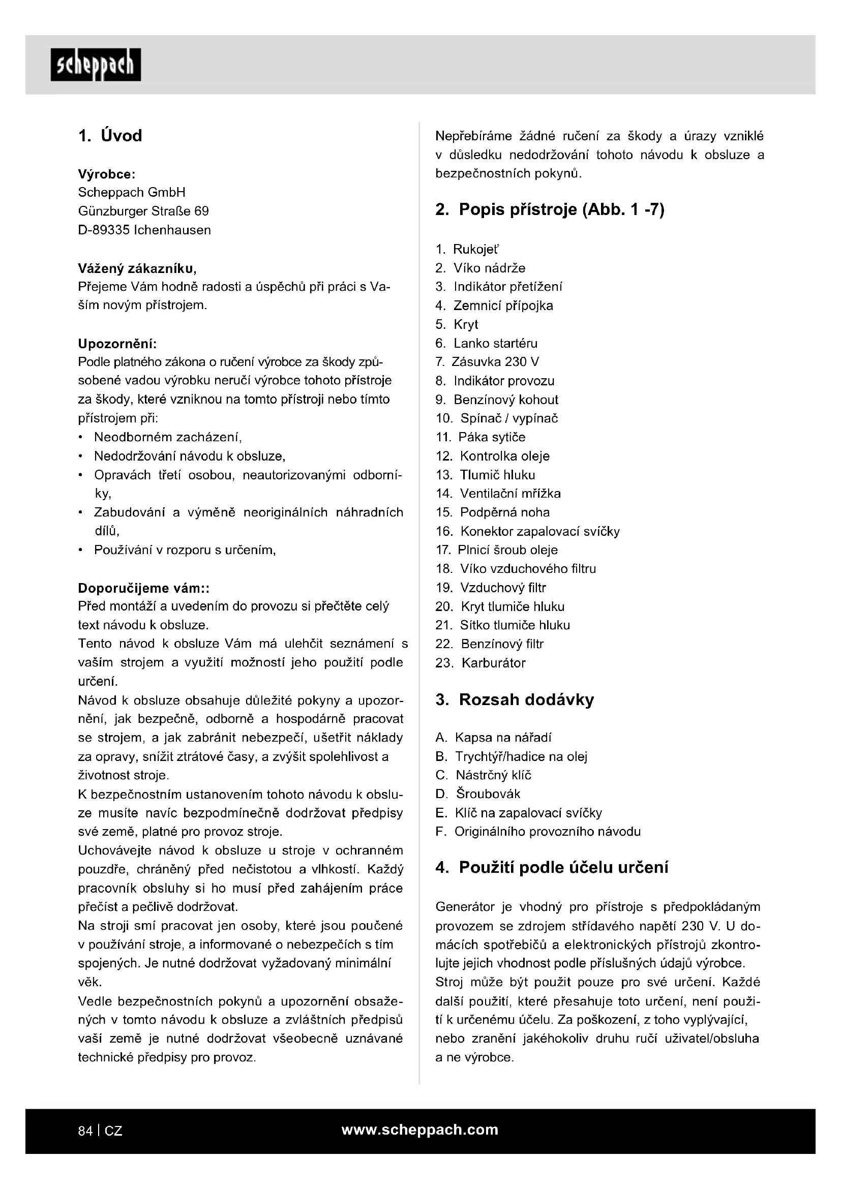 Výrobce: Scheppach GmbH Günzburger Straße 69 D-89335 Ichenhausen V ákaznk, Přejeme Vám hodně radosti a úspěchů při práci s Va- ším novým přístrojem.