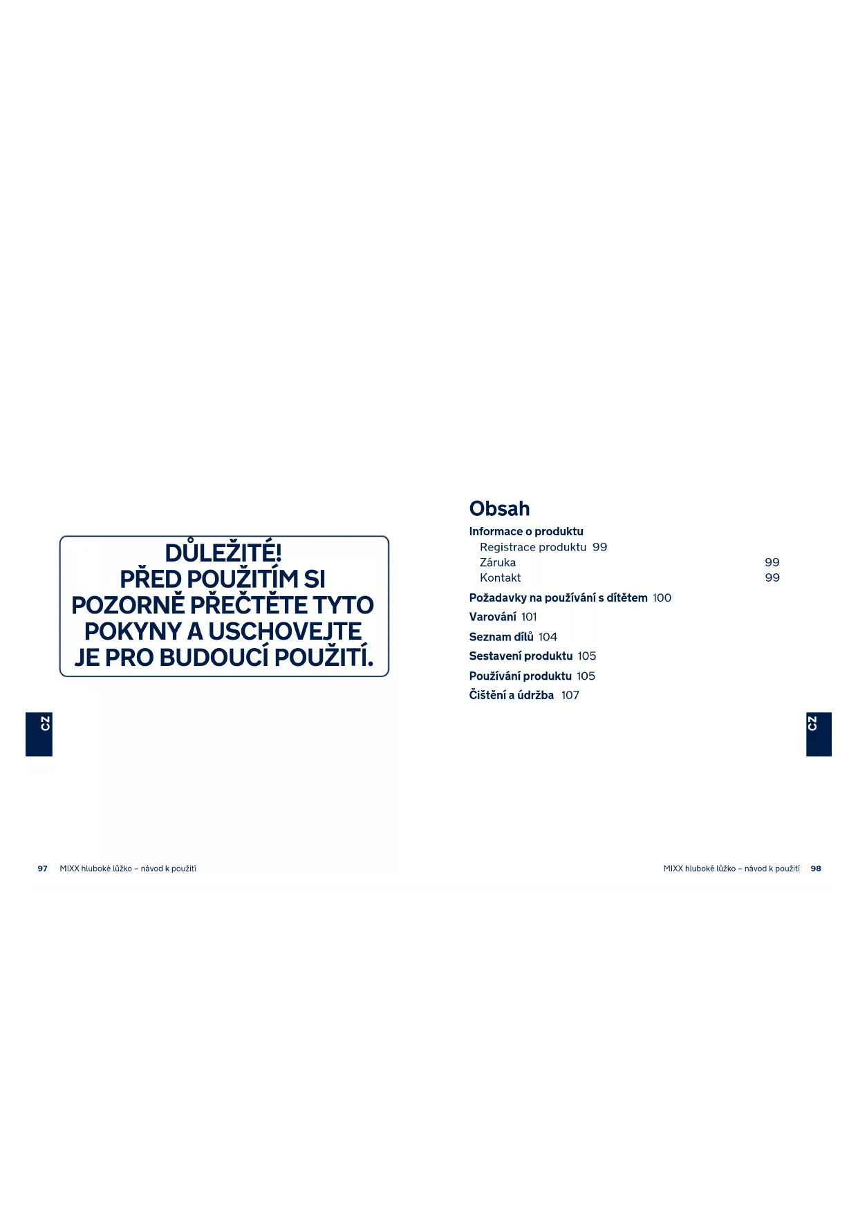 JE PRO BUDOUCÍ POUŽITÍ. Obsah Informace o produktu Registrace produktu 99 Záruka 99 Kontakt 99 Požadavky na používání s dítětem 100 Varování 101 Seznam dílů 104 Sestavení produktu 105 Používání produktu 105 Čištění a údržba 10799 MIXX hluboké lůžko – návod k použití 100MIXX hluboké lůžko – návod k použití
