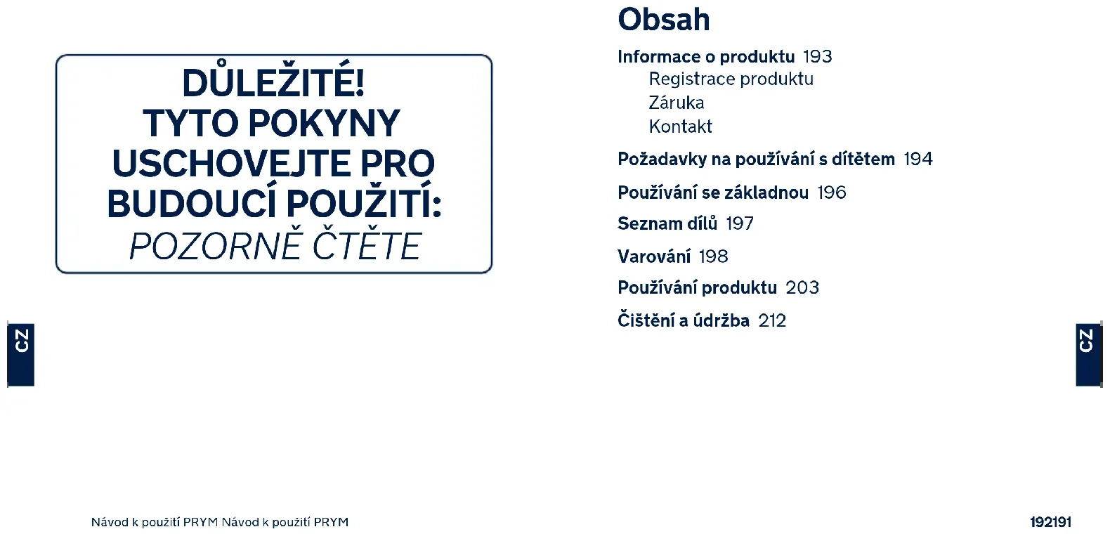 Obsah Informace o produktu 193 Registrace produktu Záruka Kontakt Požadavky na používání s dítětem 194 Používání se základnou 196 Seznam dílů 197 Varování 198 Používání produktu 203 Čištění a údržba 212194193 Návod k použití PRYM Návod k použití PRYM