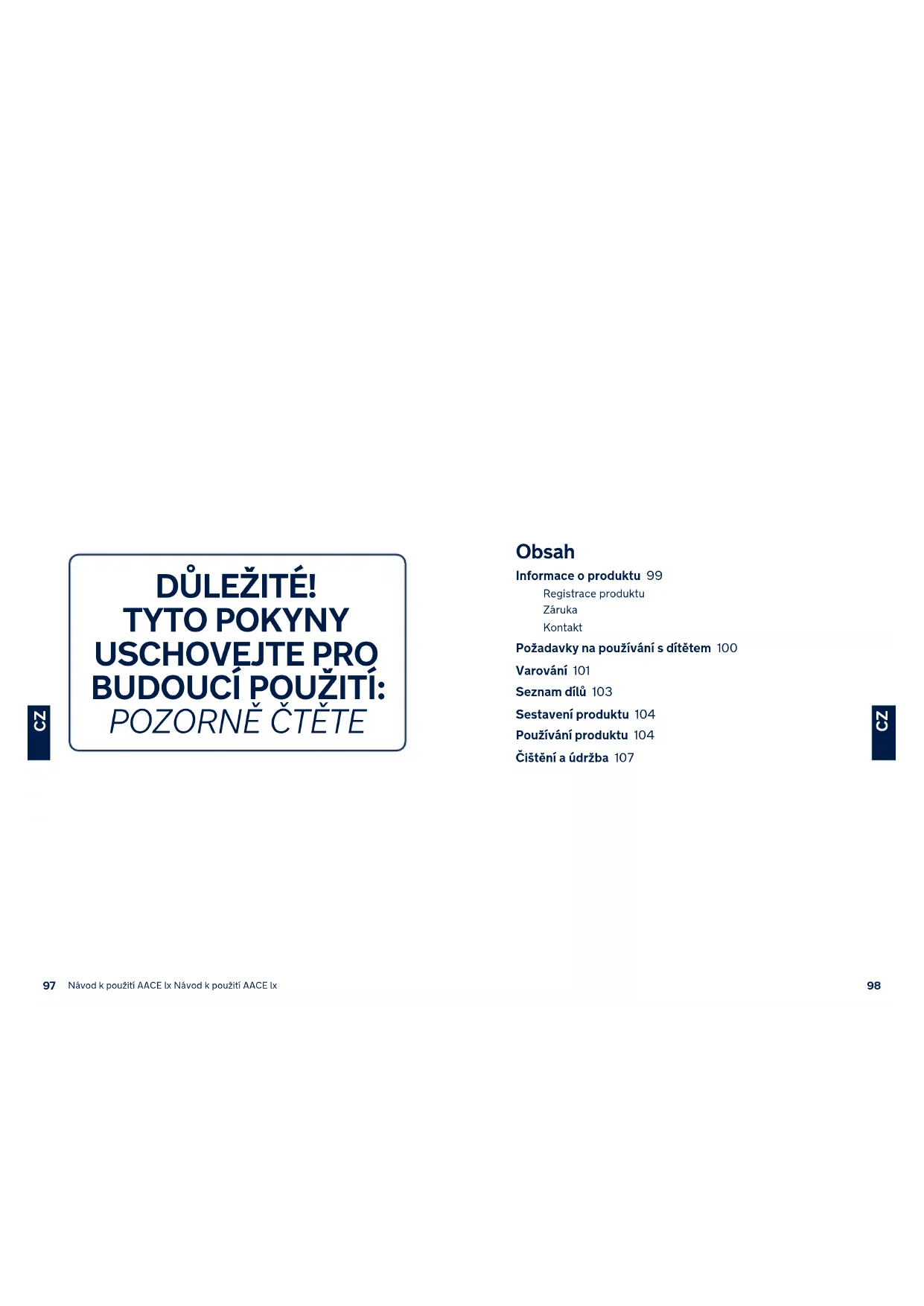 Návod k použití AACE lx Návod k použití AACE lxVAROVÁNÍ ŽÁDNÁ autosedačka nezaručuje plnou ochranu před zraněním v případě nehody. Správným používáním této autosedačky se ale sníží riziko vážného zranění nebo smrti vašeho dítěte. Vždy pozorně dodržujte pokyny pro instalaci. Tím bude zaručena optimální bezpečnost při používání autosedačky. DBEJTE na to, aby pevné předměty a plastové části této vylepšené dětské autosedačky byly umístěny a instalovány tak, aby nemohly být zachyceny pohyblivým sedadlem nebo dveřmi vozidla. Aby bylo možné používat tuto autosedačku v souladu s předpisem UN R129, musí vaše dítě splňovat následující podmínky. Výška dítěte 100 - 150 cm (odpovídá věku: 3,5 - 12 let). Pouze po směru jízdy (vozidla) Tuto autosedačku pravděpodobně nebude možné nainstalovat do všech vozidel pro použití od 135 - 150 cm. Veškeré popruhy, které přidržují autosedačku k vozidlu, musí být utažené a nesmí být překroucené. Pokud byla autosedačka vystavena velkému zatížení při nehodě nebo pokud došlo k jejímu pádu, je nezbytné ji vyměnit. Tato autosedačka je určena k použití pouze v automobilu. Bez schválení zkušebnou NEPROVÁDĚJTE žádné úpravy ani rozšíření této autosedačky. NEODSTRAŇUJTE žádnou část bílého polystyrenu (EPP/EPS). V opačném případě může dojít k závažnému ohrožení bezpečnosti. NEPOUŽÍVEJTE autosedačku, pokud je její povrch rozehřátý od slunce. V ŽÁDNÉM PŘÍPADĚ neponechávejte dítě v autosedačce ani ve voze bez dozoru, a to ani na několik minut. Veškerá zavazadla nebo jiné předměty, které v případě nehody mohou způsobit zranění, musí být řádně zajištěny. Tuto autosedačku nelze používat bez látkových potahů. Látkové potahy autosedačky smí být nahrazeny pouze podle doporučení výrobce, protože se nedílnou částí podílejí na účinnosti autosedačky. Dítě v této autosedačce vždy zajistěte, i na krátkých trasách; nejvíce nehod se přihodí právě při nich. NEPONECHÁVEJTE tuto autosedačku ani jiné předměty ve voze nepřipásané nebo nezajištěné. Pokud tuto autosedačku nebudete pravidelně používat, vyjměte ji z vozu a uložte na suchém místě chráněném před sluncem. Nedoporučujeme používat autosedačku z druhé ruky s neznámou historii. Může mít skryté strukturální poškození nebo závady způsobené nesprávným používáním/ skladováním. NEPOUŽÍVEJTE žádné jiné zátěžové kontaktní body, než jsou popsány v těchto pokynech a označeny na autosedačce. Informace ohledně údržby, opravy a náhradních dílů vám poskytne prodejce. NEPOUŽÍVEJTE tuto autosedačku v následujících případech: