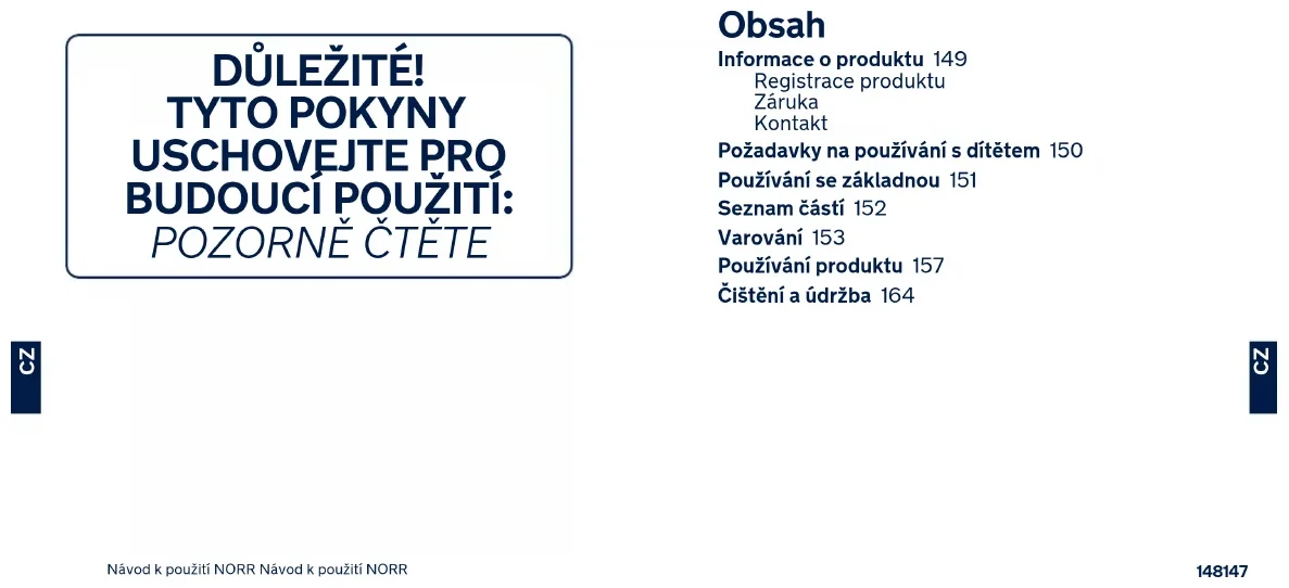 PLObsah Informace o produktu 149 Registrace produktu Záruka Kontakt Požadavky na používání s dítětem 150 Používání se základnou 151 Seznam částí 152 Varování 153 Používání produktu 157 Čištění a údržba 164 DŮLEŽITÉ! TYTO POKYNY USCHOVEJTE PRO BUDOUCÍ POUŽITÍ: