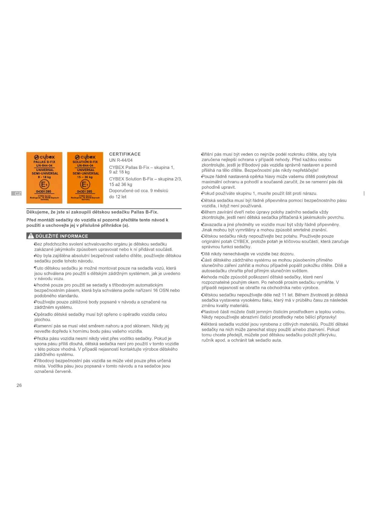CERTIFIKACE UN R-44/04 CYBEX Pallas B-Fix – skupina 1, 9 až 18 kg CYBEX Solution B-Fix – skupina 2/3, 15 až 36 kg Doporučené od cca. 9 měsíců do 12 let Děkujeme, že jste si zakoupili dětskou sedačku Pallas B-Fix. Před montáží sedačky do vozidla si pozorně přečtěte tento návod k použití a uschovejte jej v příslušné přihrádce (a).