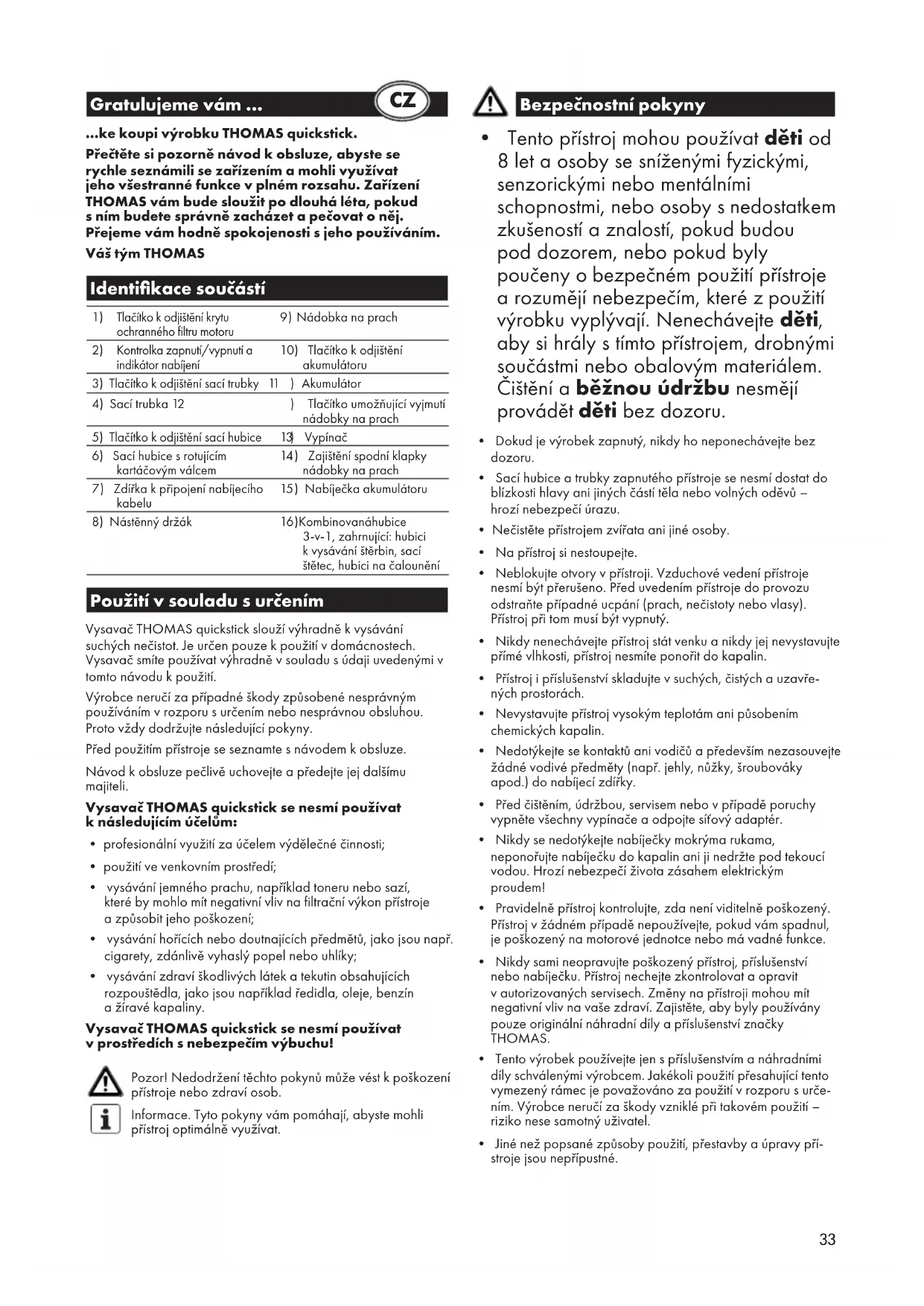 náhradu škod, které nevznikly na samotném předmětu dodávky, jsou vyloučeny, pokud taková záruka není závazně nařízena zákonem. Ipo uplynutí záruční lhůty nabízíme služby zákaznického servisu. Kontaktujte naše prodejce nebo přímo naše oddělení zákaznického servisu. Technické změny vyhrazeny.36 Blahoželáme vám… …k zakúpeniu výrobku THOMAS quickstick. Prečítajte si prosím pozorne tento návod na použitie, aby ste sa rýchlo oboznámili s vaším prístrojom a mohli v plnom rozsahu využívať jeho všestrannosť. Váš nový prístroj THOMAS vám bude slúžiť dlhé roky, keď s ním budete zaobchádzať odborne a budete ho ošetrovať. Želáme vám veľa radosti pri používaní. Váš tím THOMAS Identifikácia dielov