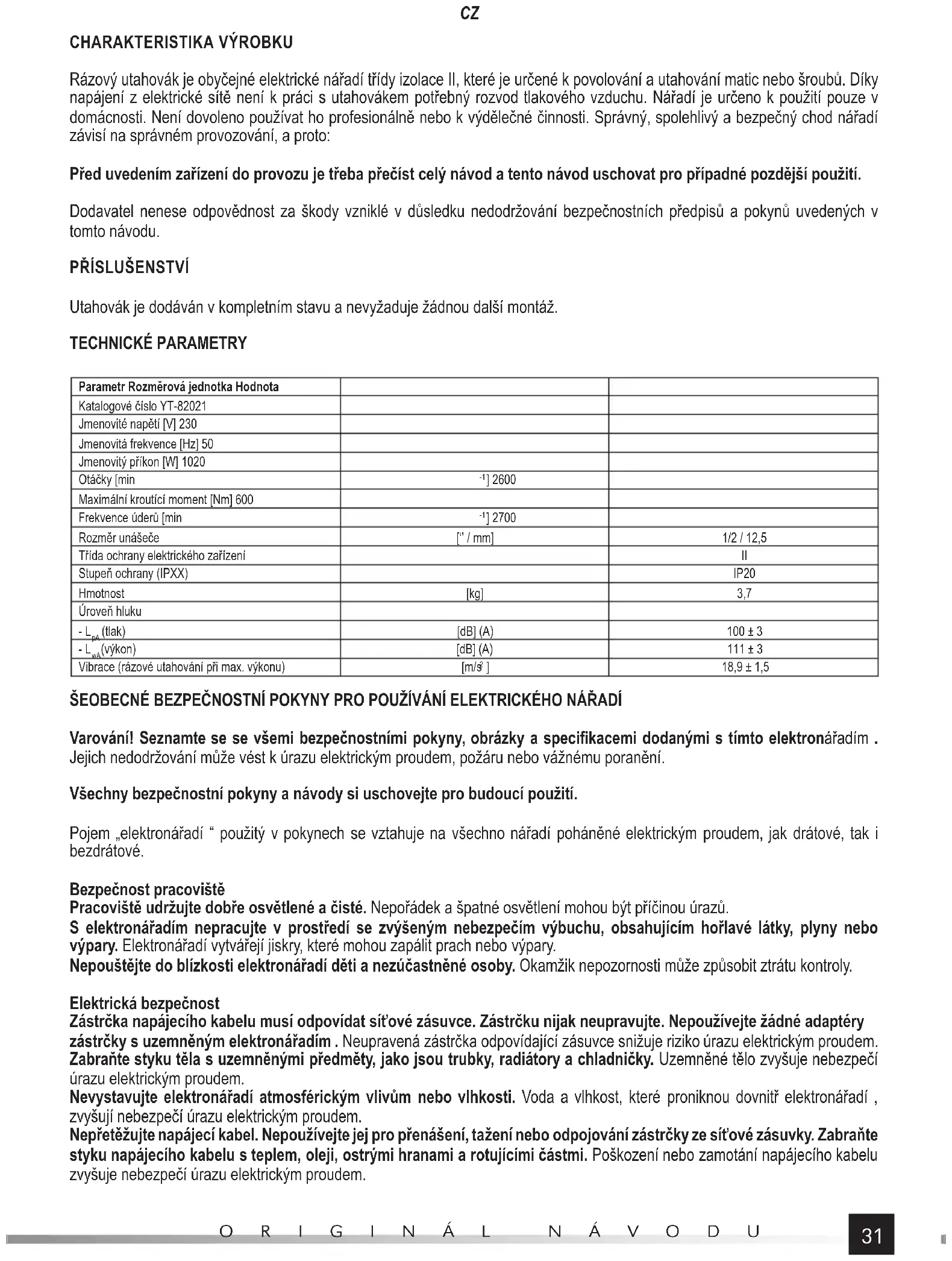 Při práci venku používejte prodlužovací kabely určené pro venkovní použití. Použití venkovního prodlužovacího kabelu snižuje riziko úrazu elektrickým proudem. V případě, že elektronářadí musíte použít ve vlhkém prostředí, použijte jako ochranu proudový chránič (RCD). Použití RCD snižuje nebezpečí úrazu elektrickým proudem. Osobní bezpečnost Buďte opatrní, dávejte pozor na to, co děláte a používejte zdravý rozum při práci s elektronářadím . Elektronářadí nepoužívejte, když jste unaveni nebo pod vlivem drog, alkoholu nebo léků. Dokonce i sebemenší nepozornost při práci může způsobit vážný úraz. Používejte osobní ochranné prostředky. Vždy pracujte s ochranou zraku. Používání osobních ochranných prostředků, jako jsou protiprachové masky, neklouzavá ochranná obuv, přilby a chrániče sluchu snižují nebezpečí vážného poranění. Zabraňte náhodnému spuštění. Ujistěte se, že síťový spínač je v poloze „vypnuto“ před připojením k elektrickému napájení a/nebo akumulátoru, zvedáním nebo přenášením elektronářadí . Přenášení elektronářadí s prstem na spínači nebo napájení elektronářadí , když je spínač v poloze „zapnuto“, může způsobit vážný úraz. Před zapnutím elektronářadí odstraňte veškeré klíče a jiné seřizovací nástroje. Klíče ponechané v rotujících částech elektronářadí mohou být příčinou úrazu. Nesahejte a nevyklánějte se příliš daleko. Udržujte stabilní postoj a rovnováhu po celou dobu práce. Umožní to snadnější ovládání elektronářadí v případě nenadálých situací při práci. Oblékejte se vhodně. Nenoste volný oděv nebo bižuterii. Vlasy a oděv mějte v dostatečné vzdálenosti od rotujících částí elektronářadí . Volný oděv, bižuterie nebo dlouhé vlasy mohou zachytit rotující části. Pokud je zařízení přizpůsobeno odtahu prachu nebo hromadění prachu, ujistěte se, že zařízení byla správně připojena a použita. Použití odtahu prachu snižuje nebezpečí spojené s prachem. Nedovolte, aby zkušenosti získané častým používáním elektronářadí byly příčinou nepozornosti a nedodržování bezpečnostních zásad. Nezodpovědné chování může způsobit vážný úraz ve zlomku sekundy. Při vrtání může upnutý nástroj narazit do skrytých vodičů pod proudem, proto držte nářadí za izolované úchyty. Upnutý nástroj při kontaktu s vodičem pod napětím může přivést proud na kovové části nářadí, což může způsobit úraz elektrickým proudem. Používání elektronářadí a servis Elektronářadí nepřetěžuje. Elektronářadí používejte pro určené použití. Technický způsobilé elektronářadí zajistí lepší a bezpečnější práci, pokud bude použito pro navržené zatížení. Elektronářadí nepoužívejte, pokud síťový spínač neumožňuje zapnutí a vypnutí. Elektronářadí , které nelze kontrolovat pomocí síťového spínače, je nebezpečné a musí se dát k opravě. Před seřízením, výměnou příslušenství nebo uschování elektronářadí odpojte zástrčku ze síťové zásuvky a/nebo vytáhněte akumulátor, pokud jej lze vyjmout z elektronářadí . Takové bezpečnostní opatření zabrání náhodnému zapnutí elektronářadí . Nářadí uchovávejte na místě nedostupném pro děti, nedovolte osobám neznalým obsluhy elektronářadí nebo těchto návodů obsluhovat elektronářadí . Elektronářadí jsou nebezpečné v rukou nezaškolených uživatelů. Provádějte údržbu elektronářadí a příslušenství. Kontrolujte je z hlediska netěsností nebo zaseknutí rotujících částí, poškození dílů a jakýchkoli jiných podmínek, které mohou ovlivnit fungování elektronářadí . Poškození opravte před použitím elektronářadí . Mnoho úrazů je způsobeno nesprávným provedením údržby elektronářadí . Řezné nástroje udržujte čisté a naostřené. Správně udržovaný řezný nástroj s ostrými hranami je méně náchylný na zaseknutí a snadněji se kontrolujte během práce. Používejte elektronářadí , příslušenství a vestavené nástroje atd. v souladu s těmito návody, se zohledněním typu a pracovních podmínek. Používání nářadí pro jinou práci, než byla navržena, může vést k nebezpečné situaci. Rukojeti a úchopné povrchy udržujte suché, čisté a bez oleje a maziv. Kluzké rukojeti a úchopné povrchy neumožňují bezpečnou obsluhu a kontrolu elektronářadí v nebezpečných situacích. Opravy Elektronářadí nechte opravit pouze v autorizovaných servisech, s použitím výlučně originálních náhradních dílů. Zajistí to správnou bezpečnou práci elektronářadí. DOPLŇUJÍCÍ BEZPEČNOSTNÍ PŘEDPISY Během používání nářadí vždy dodržujte bezpečnostní pokyny uvedené v návodu k použití a rovněž ostatní předpisy BOZP. Není dovoleno vystavovat nářadí působení atmosférických srážek. Vždy je třeba zkontrolovat, zda síťové napětí odpovídá napětí uvedenému na typovém štítku nářadí. Před zahájením používání je třeba se přesvědčit, zda používané nástavce nejsou poškozené. V případě, že bude zjištěno jejich poškození, je třeba je vyměnit za nové a nepoškozené. Používané nástrčné klíče a jiné nástroje musí být přizpůsobeny provozu s pneumatickým nářadím. Připojované nástrčné nástroje musí být v řádném technickém stavu, čisté a nepoškozené a jejich rozměry musí odpovídat rozměrům unášeče. Upravovat osazení klíčů nebo unášeče je zakázáno.33