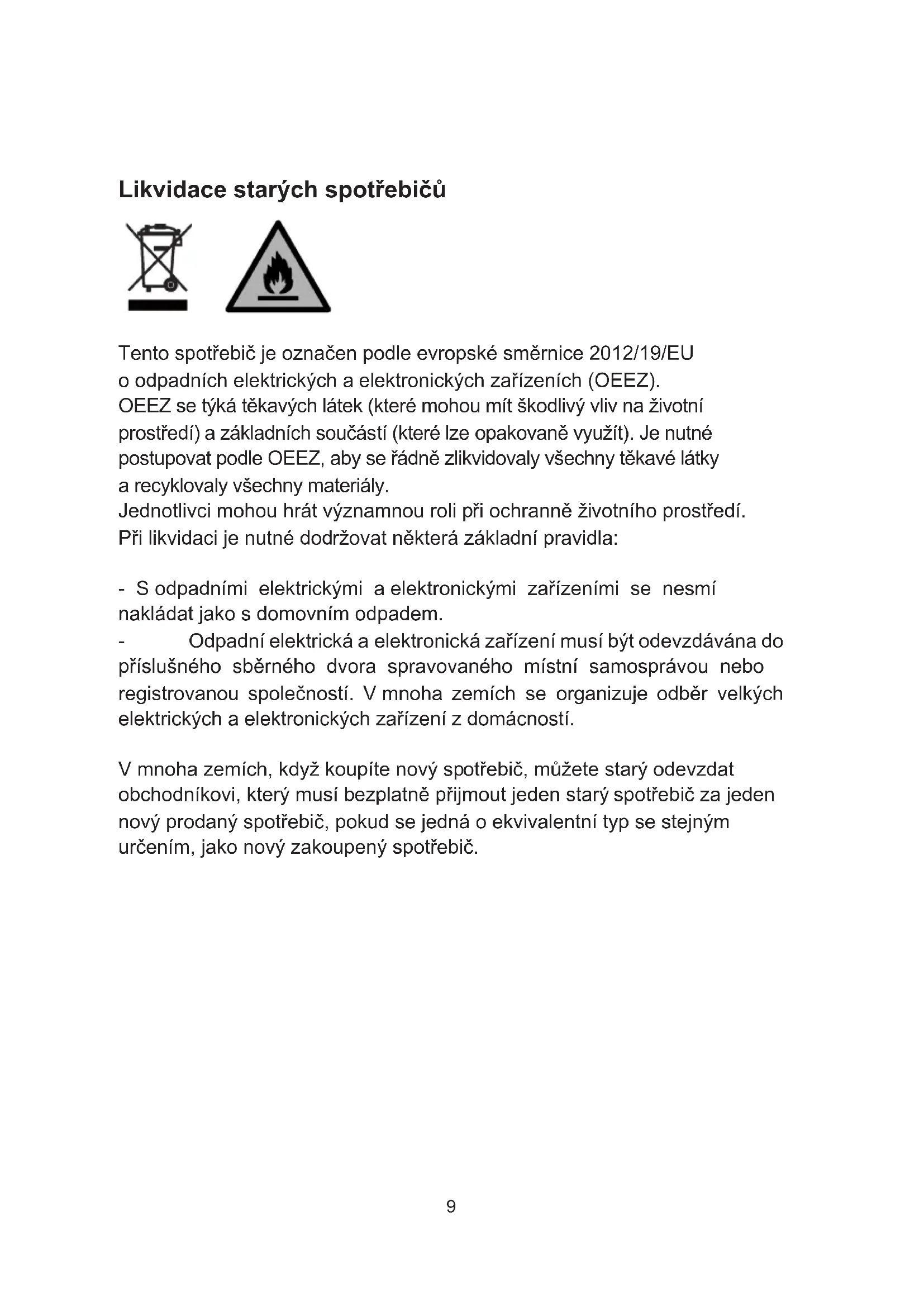 Tento spotřebič je označen podle evropské směrnice 2012/19/EU o odpadních elektrických a elektronických zařízeních (OEEZ). OEEZ se týká těkavých látek (které mohou mít škodlivý vliv na životní prostředí) a základních součástí (které lze opakovaně využít). Je nutné postupovat podle OEEZ, aby se řádně zlikvidovaly všechny těkavé látky a recyklovaly všechny materiály. Jednotlivci mohou hrát významnou roli při ochranně životního prostředí. Při likvidaci je nutné dodržovat některá základní pravidla: - S odpadními elektrickými a elektronickými zařízeními se nesmí nakládat jako s domovním odpadem. - Odpadní elektrická a elektronická zařízení musí být odevzdávána do příslušného sběrného dvora spravovaného místní samosprávou nebo registrovanou společností. V mnoha zemích se organizuje odběr velkých elektrických a elektronických zařízení z domácností. V mnoha zemích, když koupíte nový spotřebič, můžete starý odevzdat obchodníkovi, který musí bezplatně přijmout jeden starý spotřebič za jeden nový prodaný spotřebič, pokud se jedná o ekvivalentní typ se stejným určením, jako nový zakoupený spotřebič. ê3ĜHKOHG