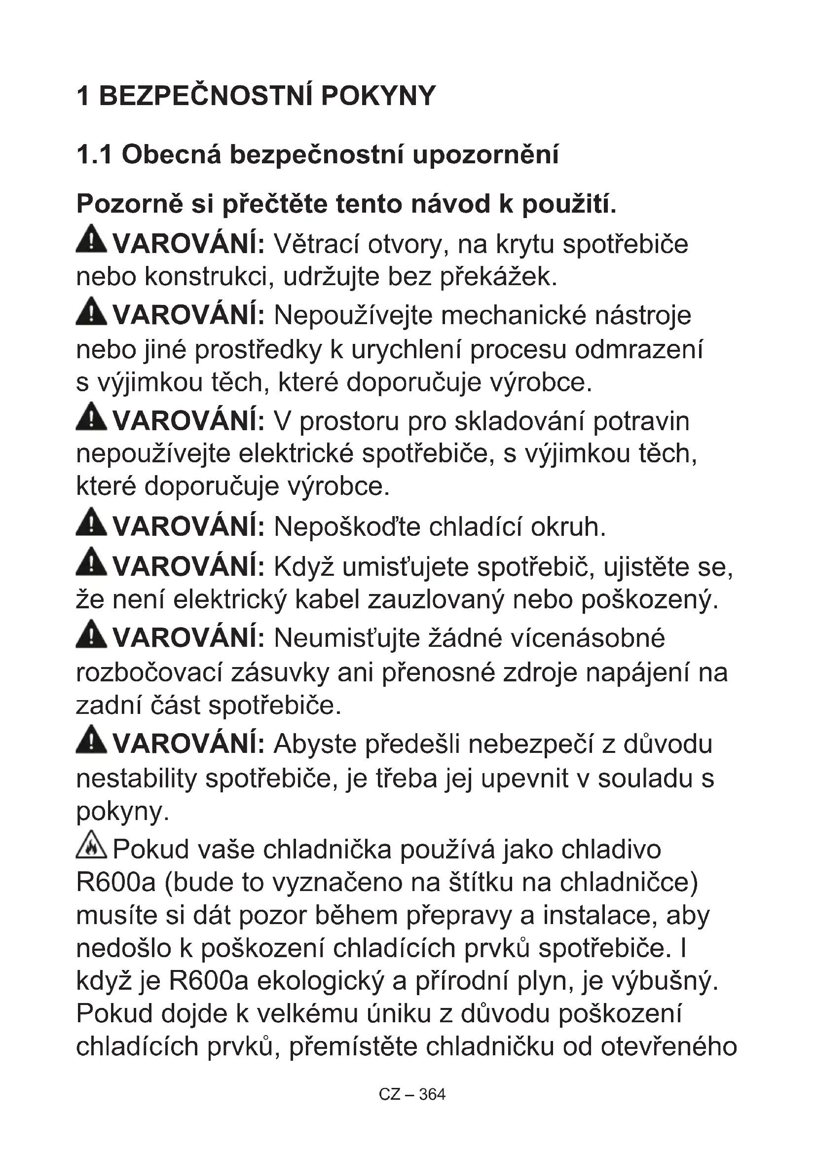 Pozorně si přečtěte tento návod k použití. VAROVÁNÍ: Větrací otvory, na krytu spotřebiče nebo konstrukci, udržujte bez překážek. VAROVÁNÍ: Nepoužívejte mechanické nástroje nebo jiné prostředky k urychlení procesu odmrazení s výjimkou těch, které doporučuje výrobce. VAROVÁNÍ: V prostoru pro skladování potravin nepoužívejte elektrické spotřebiče, s výjimkou těch, které doporučuje výrobce. VAROVÁNÍ: Nepoškoďte chladící okruh. VAROVÁNÍ: Když umisťujete spotřebič, ujistěte se, že není elektrický kabel zauzlovaný nebo poškozený. VAROVÁNÍ: Neumisťujte žádné vícenásobné rozbočovací zásuvky ani přenosné zdroje napájení na zadní část spotřebiče. VAROVÁNÍ: Abyste předešli nebezpečí z důvodu nestability spotřebiče, je třeba jej upevnit v souladu s pokyny. Pokud vaše chladnička používá jako chladivo R600a (bude to vyznačeno na štítku na chladničce) musíte si dát pozor během přepravy a instalace, aby nedošlo k poškození chladících prvků spotřebiče. I když je R600a ekologický a přírodní plyn, je výbušný. Pokud dojde k velkému úniku z důvodu poškození chladících prvků, přemístěte chladničku od otevřenéhoCZ – 365 ohně nebo zdrojů tepla a místnost, v níž je spotřebič umístěný, několik minut větrejte.