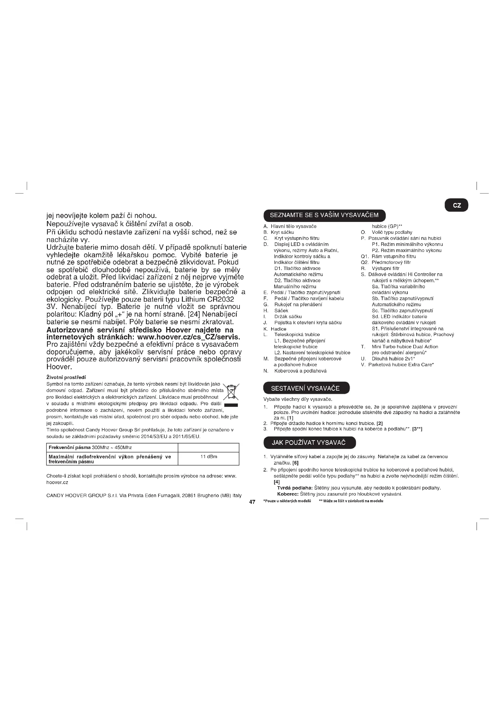 CZĘŚCI ZAPASOWE I MATERIAŁY EKSPLOATACYJNE MARKI HOOVER Należy zawsze wymieniać części na oryginalne części zapasowe rmy Hoover. Można je nabyć w lokalnym serwisie rmy Hoover lub bezpośrednio w rmie Hoover. Przy zamawianiu części zawsze należy podać numer danego modelu. Serwis rmy Hoover Jeśli kiedykolwiek wymagana będzie naprawa, należy skontaktować się z lokalnym punktem serwisowym rmy Hoover. Jakość Fabryki rmy HOOVER zostały poddane niezależnej kontroli pod kątem jakości. Nasze produkty zostały wytworzone z wykorzystaniem systemu kontroli jakości spełniającego wymogi normy ISO 9001. GWARANCJA Warunki gwarancji na niniejsze urządzenie są określone przez naszego przedstawiciela w kraju, w którym urządzenie jest sprzedawane. Szczegółowe informacje na temat warunków gwarancji można uzyskać w punkcie, w którym urządzenie zostało nabyte. Przy zgłaszaniu wszelkich roszczeń w ramach gwarancji należy przedstawić dowód sprzedaży lub pokwitowanie. Zastrzegamy sobie możliwość wprowadzania zmian bez wcześniejszego powiadomienia. NÁVOD K BEZPEČNÉMU POUŽITÍ Tento vysavač by měl být používán pouze pro úklid domácnosti a v souladu s touto uživatelskou příručkou. Než začnete spotřebič používat, prosím, ujistěte se, že rozumíte tomuto návodu. Nenechávejte vysavač zapojený v zásuvce. Po použití, před čištěním nebo jakoukoli údržbou zařízení vždy vypněte a síťový kabel vytáhněte ze zásuvky. Tento přístroj smí používat děti od 8 let výše. Osoby se sníženými fyzickými, smyslovými nebo mentálními schopnostmi nebo s nedostatkem zkušeností a znalostí smí tento přístroj používat, pokud jsou pod dohledem nebo jim byly dány pokyny týkající se bezpečného používání a byly seznámeny s možnými riziky. S přístrojem si nesmí hrát děti. Čištění a údržbu nesmí provádět děti bez dozoru. Jestliže je poškozen síťový kabel, okamžitě přestaňte zařízení používat. Síťový kabel musí vyměnit autorizovaný servisní pracovník společnosti Hoover, aby nedošlo k ohrožení bezpečnosti při práci s přístrojem. Udržujte dostatečnou vzdálenost rukou, nohou, volného oděvu a vlasů z dosahu otočných kartáčů. Používejte výhradně příslušenství, spotřební materiál a náhradní díly doporučené nebo dodávané rmou HOOVER. Statická elektřina: Při čištění některých koberců vzniká malé množství statické elektřiny. Vzniklé výboje statické elektřiny nejsou zdraví nebezpečné. Nepoužívejte vaše zařízení venku, nebo na mokré povrchy a na mokrá vysávání. Nevysávejte tvrdé nebo ostré předměty, zápalky, žhavý popel, cigaretové nedopalky a podobné předměty. Nestříkejte při používání vysavače nebo nevysávejte hořlavé kapaliny, čistící tekutiny, aerosoly nebo jejich výpary. Během používání vysavače nepřejíždějte přes síťový kabel a nevytahujte síťový kabel ze zásuvky taháním za něj. Nepoužívejte zařízení, pokud vám připadá vadné. Během použití vysavače nešlapejte na síťový kabel, ani si CZ47 jej neovíjejte kolem paží či nohou. Nepoužívejte vysavač k čištění zvířat a osob. Při úklidu schodů nestavte zařízení na vyšší schod, než se nacházíte vy. Udržujte baterie mimo dosah dětí. V případě spolknutí baterie vyhledejte okamžitě lékařskou pomoc. Vybité baterie je nutné ze spotřebiče odebrat a bezpečně zlikvidovat. Pokud se spotřebič dlouhodobě nepoužívá, baterie by se měly odebrat a uložit. Před likvidací zařízení z něj nejprve vyjměte baterie. Před odstraněním baterie se ujistěte, že je výrobek odpojen od elektrické sítě. Zlikvidujte baterie bezpečně a ekologicky. Používejte pouze baterii typu Lithium CR2032 3V. Nenabíjecí typ. Baterie je nutné vložit se správnou polaritou: Kladný pól „+“ je na horní straně. [24] Nenabíjecí baterie se nesmí nabíjet. Póly baterie se nesmí zkratovat. Autorizované servisní středisko Hoover najdete na internetových stránkách: www.hoover.cz/cs_CZ/servis. Pro zajištění vždy bezpečné a efektivní práce s vysavačem doporučujeme, aby jakékoliv servisní práce nebo opravy prováděl pouze autorizovaný servisní pracovník společnosti Hoover. Životní prostředí Symbol na tomto zařízení označuje, že tento výrobek nesmí být likvidován jako domovní odpad. Zařízení musí být předáno do příslušného sběrného místa pro likvidaci elektrických a elektronických zařízení. Likvidace musí proběhnout v souladu s místními ekologickými předpisy pro likvidaci odpadu. Pro další podrobné informace o zacházení, novém použití a likvidaci tohoto zařízení, prosím, kontaktujte váš místní úřad, společnost pro sběr odpadu nebo obchod, kde jste jej zakoupili. Tímto společnost Candy Hoover Group Srl prohlašuje, že toto zařízení je označeno v souladu se základními požadavky směrnic 2014/53/EU a 2011/65/EU. Chcete-li získat kopii prohlášení o shodě, kontaktujte prosím výrobce na adrese: www. hoover.cz CANDY HOOVER GROUP S.r.l. Via Privata Eden Fumagalli, 20861 Brugherio (MB) Italy