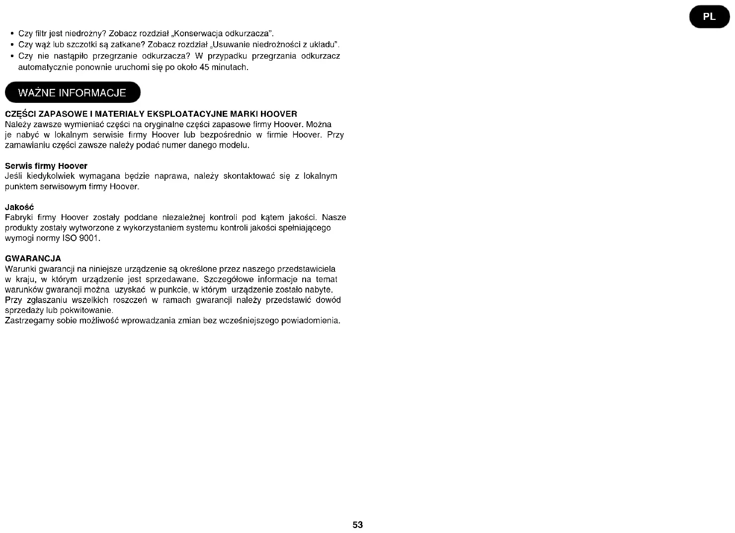 NÁHRADNÍ DÍLY A SPOTŘEBNÍ MATERIÁLY HOOVER Vždy používejte originální náhradní díly společnosti Hoover. Získáte je u místního prodejce výrobků Hoover nebo u servisních partnerů. Při objednávce dílů laskavě vždy uvádějte číslo modelu. Servis společnosti Hoover S opravami se obracejte vždy na místní servisní středisko společnosti Hoover. Kvalita Kvalita výroby ve výrobních továrnách společnosti Hoover byla posouzena nezávislou organizací. Naše výrobky jsou vyráběny podle systému jakosti, který splňuje požadavky ISO 9001.
