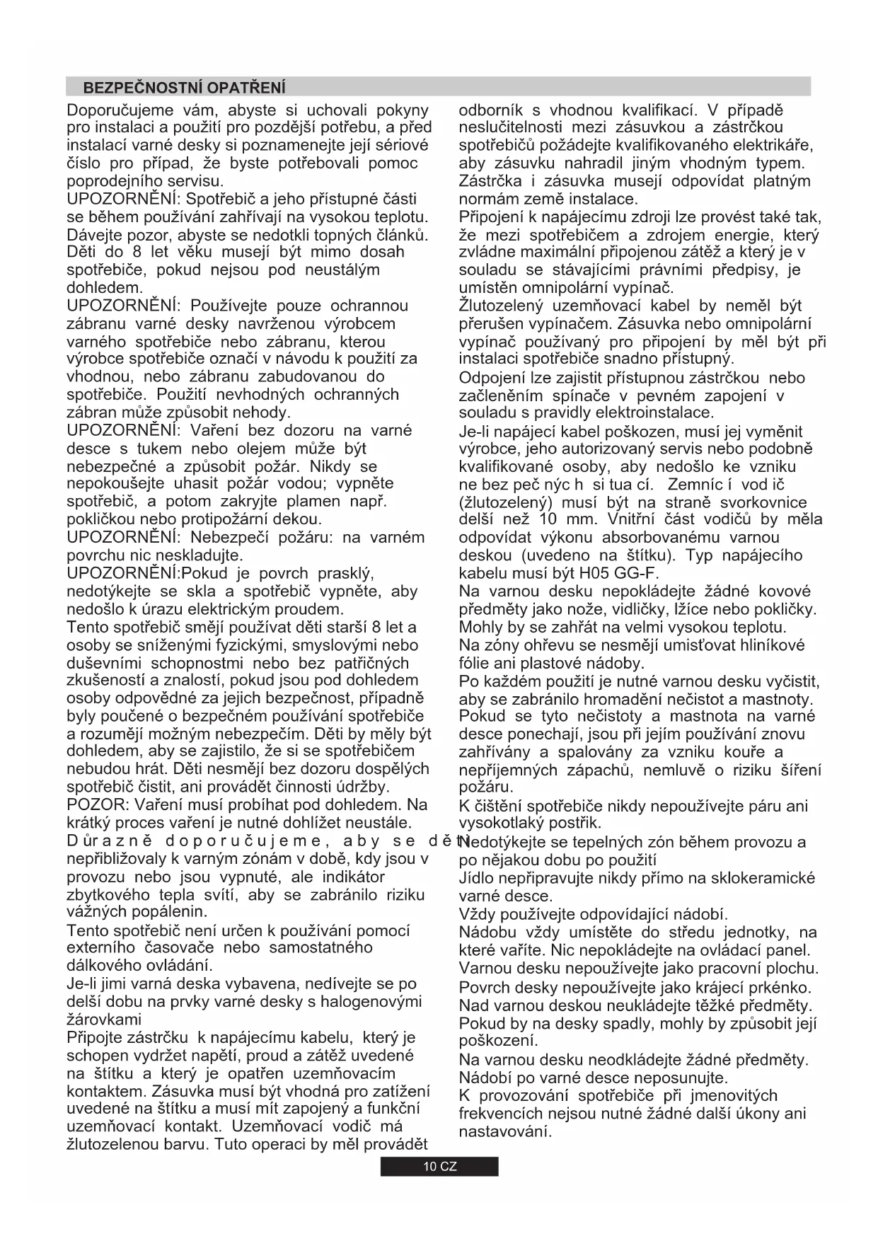 L'appareil est conforme à la Directive européenne 2009/142/CE (GAD) et à partir du 21/04/2018, à la Réglementation sur les appareils à gaz 2016/426 (GAR). En utilisant le symbol sur ce produit, nous déclarons sur notre propre responsabilité que ce produit est conforme à toutes les normes Européennes relatives à la sécurité, la santé et à l’environnement.10 CZ Doporučujeme vám, abyste si uchovali pokyny pro instalaci a použití pro pozdější potřebu, a před instalací varné desky si poznamenejte její sériové číslo pro případ, že byste potřebovali pomoc poprodejního servisu. UPOZORNĚNÍ: Spotřebič a jeho přístupné části se během používání zahřívají na vysokou teplotu. Dávejte pozor, abyste se nedotkli topných článků. Děti do 8 let věku musejí být mimo dosah spotřebiče, pokud nejsou pod neustálým dohledem. UPOZORNĚNÍ: Používejte pouze ochrannou zábranu varné desky navrženou výrobcem varného spotřebiče nebo zábranu, kterou výrobce spotřebiče označí v návodu k použití za vhodnou, nebo zábranu zabudovanou do spotřebiče. Použití nevhodných ochranných zábran může způsobit nehody. UPOZORNĚNÍ: Vaření bez dozoru na varné desce s tukem nebo olejem může být nebezpečné a způsobit požár. Nikdy se nepokoušejte uhasit požár vodou; vypněte spotřebič, a potom zakryjte plamen např. pokličkou nebo protipožární dekou. UPOZORNĚNÍ: Nebezpečí požáru: na varném povrchu nic neskladujte. UPOZORNĚNÍ:Pokud je povrch prasklý, nedotýkejte se skla a spotřebič vypněte, aby nedošlo k úrazu elektrickým proudem. Tento spotřebič smějí používat děti starší 8 let a osoby se sníženými fyzickými, smyslovými nebo duševními schopnostmi nebo bez patřičných zkušeností a znalostí, pokud jsou pod dohledem osoby odpovědné za jejich bezpečnost, případně byly poučené o bezpečném používání spotřebiče a rozumějí možným nebezpečím. Děti by měly být dohledem, aby se zajistilo, že si se spotřebičem nebudou hrát. Děti nesmějí bez dozoru dospělých spotřebič čistit, ani provádět činnosti údržby. POZOR: Vaření musí probíhat pod dohledem. Na krátký proces vaření je nutné dohlížet neustále. D ůr a z n ě d o p o r u č u j e m e , a b y s e d ě t i nepřibližovaly k varným zónám v době, kdy jsou v provozu nebo jsou vypnuté, ale indikátor zbytkového tepla svítí, aby se zabránilo riziku vážných popálenin. Tento spotřebič není určen k používání pomocí externího časovače nebo samostatného dálkového ovládání. Je-li jimi varná deska vybavena, nedívejte se po delší dobu na prvky varné desky s halogenovými žárovkami Připojte zástrčku k napájecímu kabelu, který je schopen vydržet napětí, proud a zátěž uvedené na štítku a který je opatřen uzemňovacím kontaktem. Zásuvka musí být vhodná pro zatížení uvedené na štítku a musí mít zapojený a funkční uzemňovací kontakt. Uzemňovací vodič má žlutozelenou barvu. Tuto operaci by měl provádět