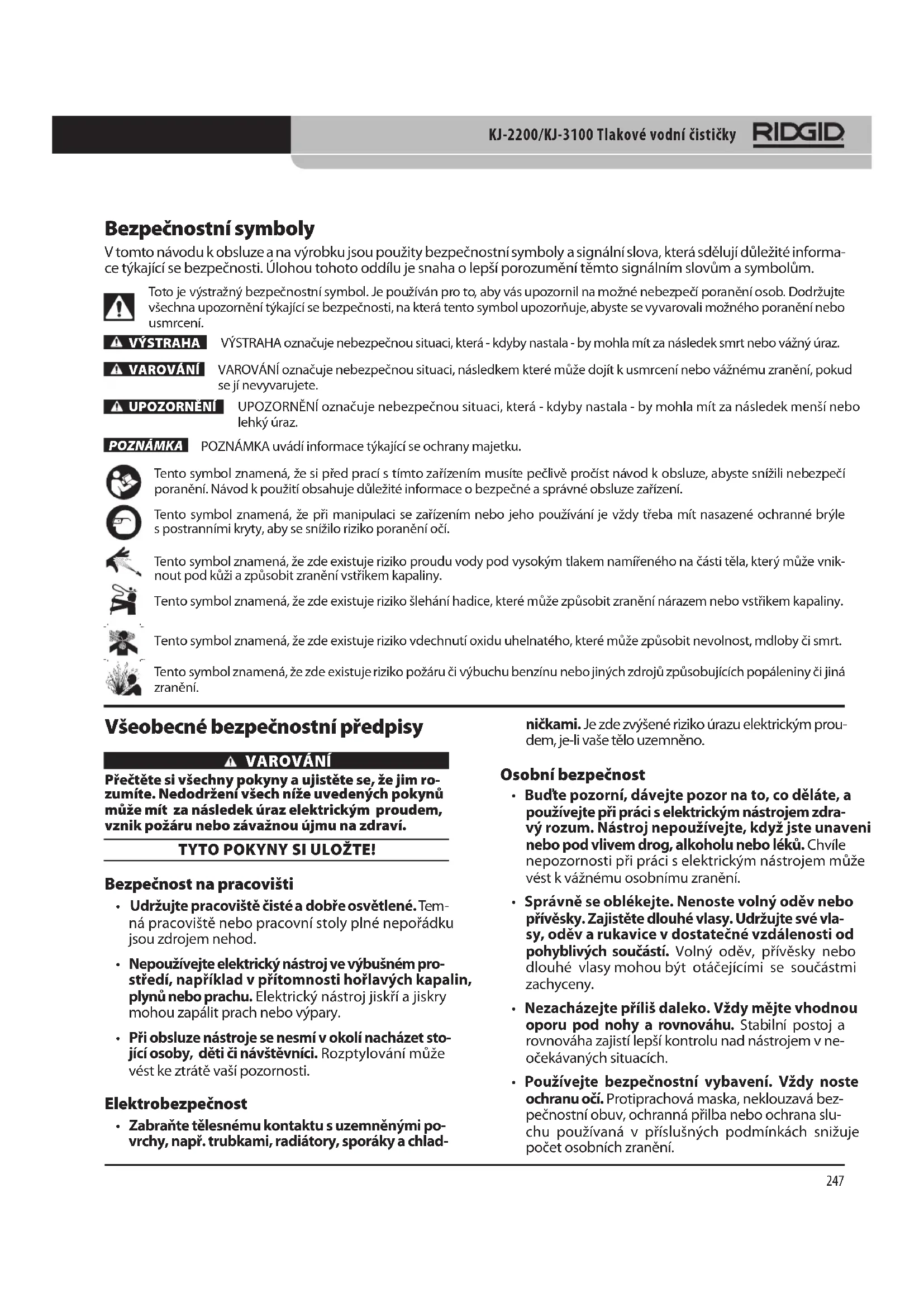 Bezpečnostní symboly V tomto návodu k obsluze a na výrobku jsou použity bezpečnostní symboly a signální slova, která sdělují důležité informa- ce týkající se bezpečnosti. Úlohou tohoto oddílu je snaha o lepší porozumění těmto signálním slovům a symbolům. Toto je výstražný bezpečnostní symbol. Je používán pro to, aby vás upozornil na možné nebezpečí poranění osob. Dodržujte všechna upozornění týkající se bezpečnosti, na která tento symbol upozorňuje, abyste se vyvarovali možného poranění nebo usmrcení.VÝSTRAHAVAROVÁNÍUPOZORNĚNÍPOZNÁMKAVÝSTRAHA označuje nebezpečnou situaci, která - kdyby nastala - by mohla mít za následek smrt nebo vážný úraz.VAROVÁNÍ označuje nebezpečnou situaci, následkem které může dojít k usmrcení nebo vážnému zranění, pokud se jí nevyvarujete.UPOZORNĚNÍ označuje nebezpečnou situaci, která - kdyby nastala - by mohla mít za následek menší nebo lehký úraz.POZNÁMKA uvádí informace týkající se ochrany majetku. Tento symbol znamená, že si před prací s tímto zařízením musíte pečlivě pročíst návod k obsluze, abyste snížili nebezpečí poranění. Návod k použití obsahuje důležité informace o bezpečné a správné obsluze zařízení. Tento symbol znamená, že při manipulaci se zařízením nebo jeho používání je vždy třeba mít nasazené ochranné brýle s postranními kryty, aby se snížilo riziko poranění očí. Tento symbol znamená, že zde existuje riziko proudu vody pod vysokým tlakem namířeného na části těla, který může vnik- nout pod kůži a způsobit zranění vstřikem kapaliny.Tento symbol znamená, že zde existuje riziko šlehání hadice, které může způsobit zranění nárazem nebo vstřikem kapaliny.Tento symbol znamená, že zde existuje riziko vdechnutí oxidu uhelnatého, které může způsobit nevolnost, mdloby či smrt. Tento symbol znamená, že zde existuje riziko požáru či výbuchu benzínu nebo jiných zdrojů způsobujících popáleniny či jiná zranění. Všeobecné bezpečnostní předpisy VAROVÁNÍ Přečtěte si všechny pokyny a ujistěte se, že jim ro-zumíte. Nedodržení všech níže uvedených pokynů může mít za následek úraz elektrickým proudem, vznik požáru nebo závažnou újmu na zdraví. TYTO POKYNY SI ULOŽTE! Bezpečnost na pracovišti