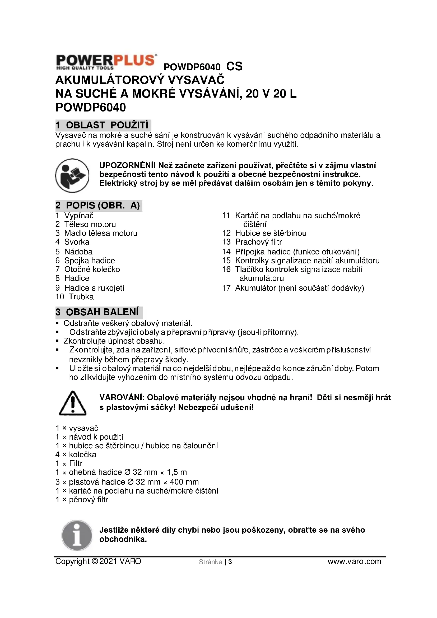 - Neukládejte jej v plastových pytlích, ve kterých by se hromadila vlhkost.POWDP6040 CS Copyright © 2021 VARO Stránka | 10 www.varo.com 14 ZÁRUKA