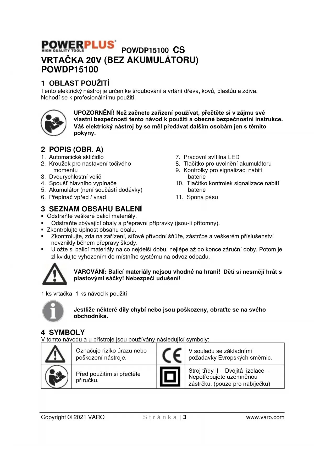 Stroj třídy II – Dvojitá izolace – Nepotřebujete uzemněnou zástrčku. (pouze pro nabíječku)POWDP15100 CS Copyright © 2021 VARO S t r á n k a | 4 www.varo.com