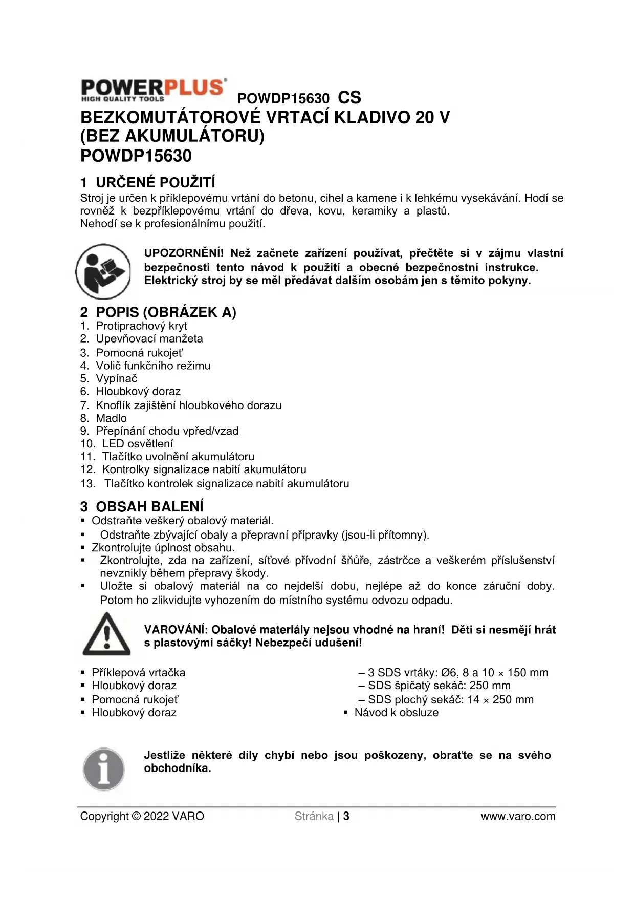 - Servisní práce na elektrickém stroji přenechejte kvalifikovanému technikovi, který používá výhradně originální náhradní díly. Tak zajistíte, že stroj bude i nadále bezpečný.POWDP15630 CS Copyright © 2022 VARO Stránka | 6 www.varo.com 6 DOPLŇUJÍCÍ BEZPEČNOSTNÍ POKYNY PRO VRTAČKY