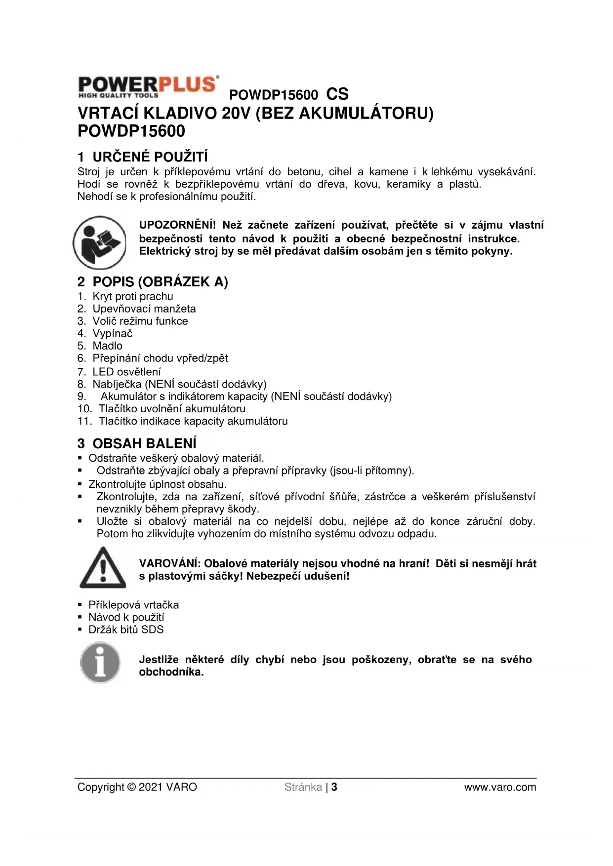 - Omezené samovybíjení (viz také kapitolu „Uskladnění“).POWDP15600 CS Copyright © 2021 VARO Stránka | 8 www.varo.com 9 PROVOZ