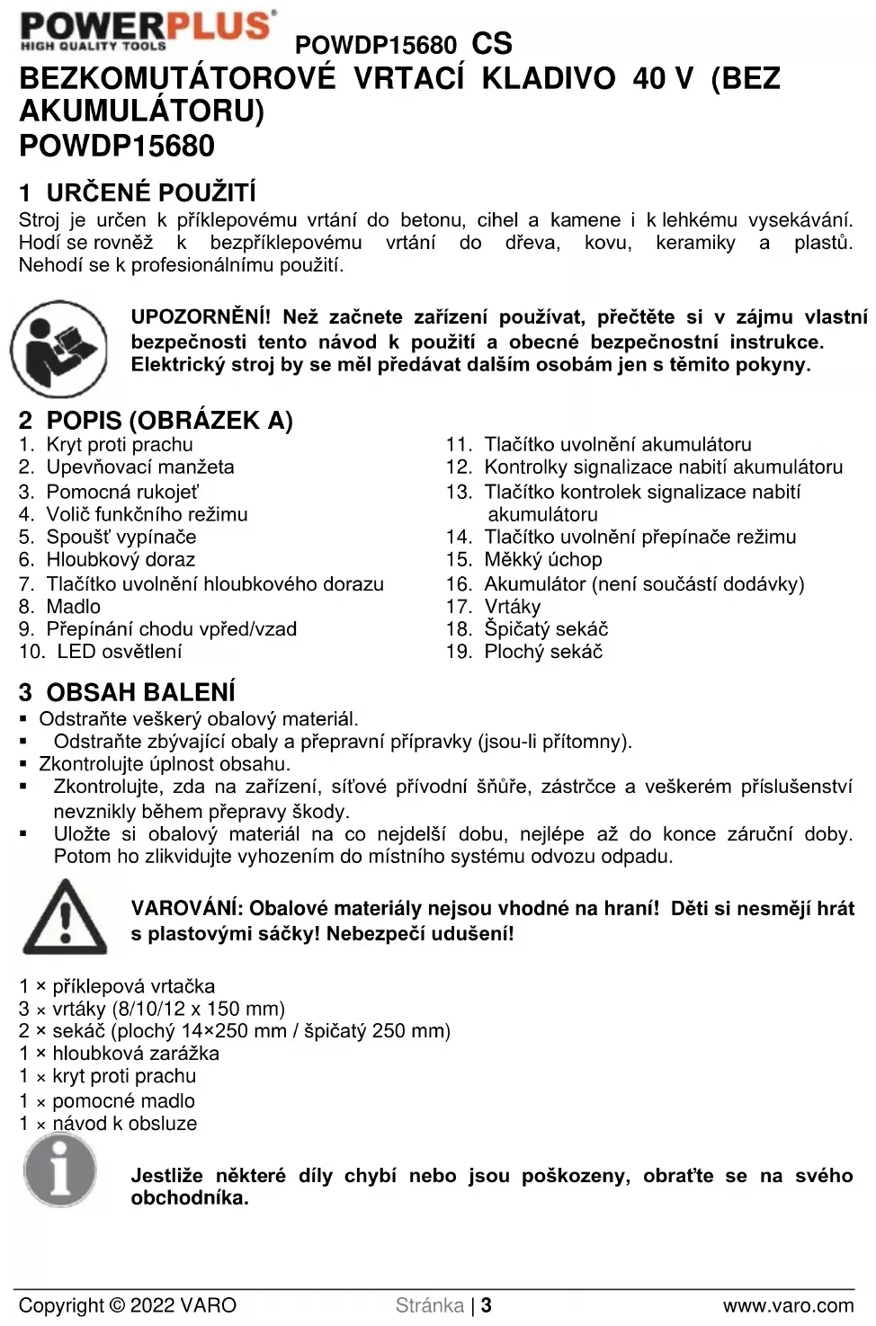 Stáhněte si návod pro váš Vrtačka ve formátu PDF zdarma! Najděte svůj návod POWDP15680 - PowerPlus a vezměte svůj elektronický přístroj zpět do rukou. Na této stránce jsou zveřejněny všechny dokumenty potřebné k používání vašeho zařízení. POWDP15680 značky PowerPlus.