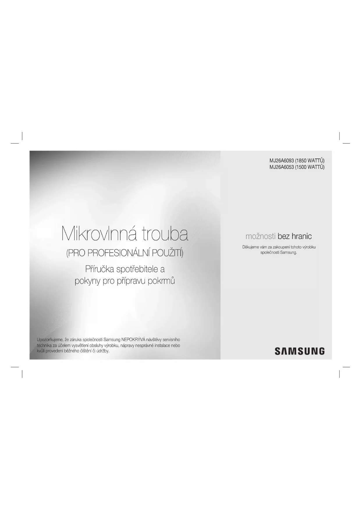 www.samsung.com/bg/supportMikrovlnná trouba (PRO PROFESIONÁLNÍ POUŽITÍ) Příručka spotřebitele a pokyny pro přípravu pokrmů MJ26A6093 (1850 WATTŮ) MJ26A6053 (1500 WATTŮ) možnosti bez hranic Děkujeme vám za zakoupení tohoto výrobku společnosti Samsung. Upozorňujeme, že záruka společnosti Samsung NEPOKRÝVÁ návštěvy servisního technika za účelem vysvětlení obsluhy výrobku, nápravy nesprávné instalace nebo kvůli provedení běžného čištění či údržby.2 ČEŠTINA OBSAH POUŽITÍ TÉTO PŘÍRUČKY Právě jste zakoupili mikrovlnnou troubu SAMSUNG. Uživatelská příručka obsahuje cenné informace o přípravě pokrmů v mikrovlnné troubě:
