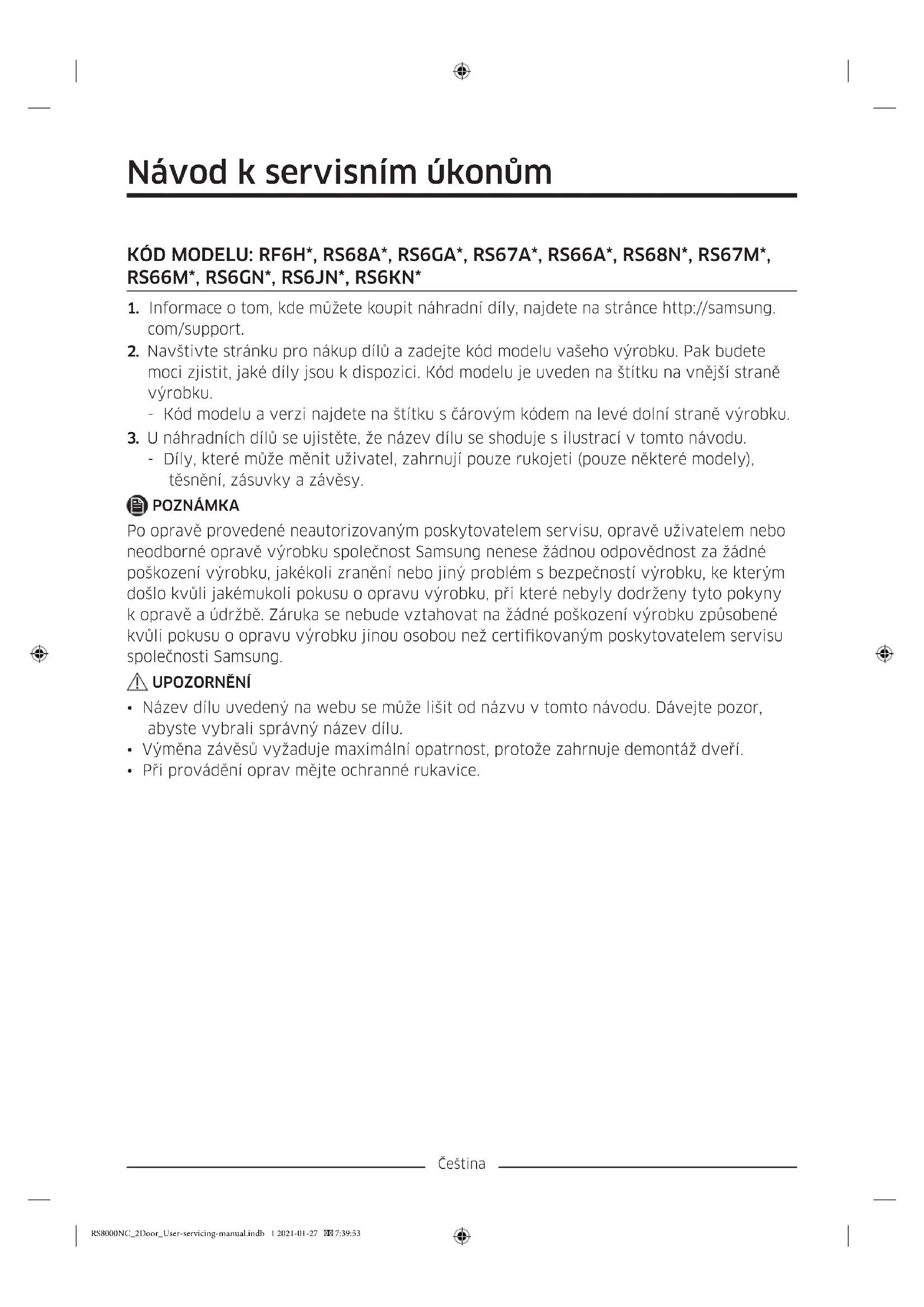 suchou zásuvku. Zpětné nasazení zásuvek Nasazení zásuvek probíhá v opačném pořadí kroků postupu pro jejich vyjmutí. RS8000NC_2Door_User-servicing-manual.indb 4 2021-01-27 7:39:53Čeština Výměna závěsu Při výměně závěsů je třeba nejprve demontovat dveře. UPOZORNĚNÍ
