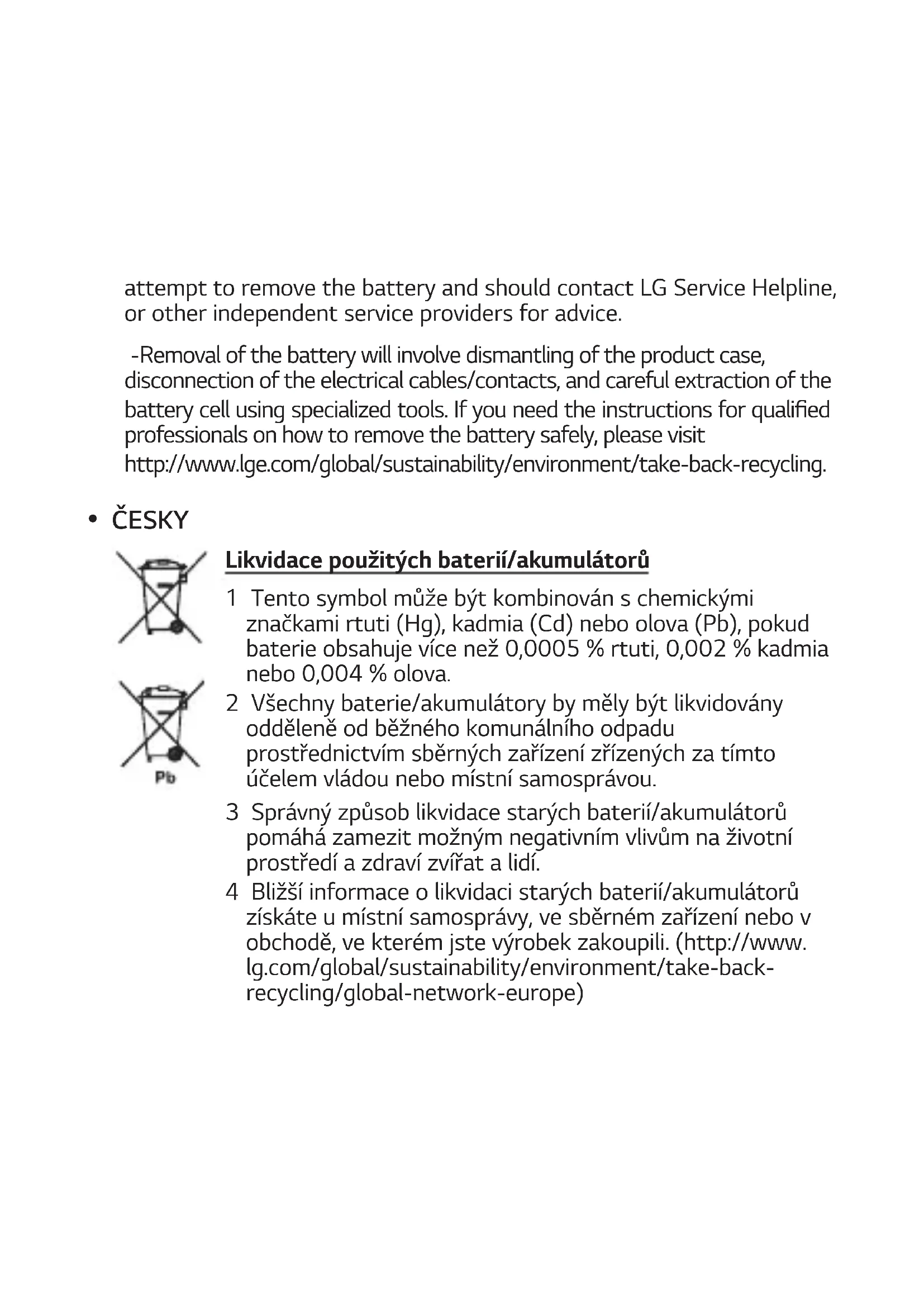 ČESKY Likvidace použitých baterií/akumulátorů 1 Tento symbol může být kombinován s chemickými značkami rtuti (Hg), kadmia (Cd) nebo olova (Pb), pokud baterie obsahuje více než 0,0005 % rtuti, 0,002 % kadmia nebo 0,004 % olova. 2 Všechny baterie/akumulátory by měly být likvidovány odděleně od běžného komunálního odpadu prostřednictvím sběrných zařízení zřízených za tímto účelem vládou nebo místní samosprávou. 3 Správný způsob likvidace starých baterií/akumulátorů pomáhá zamezit možným negativním vlivům na životní prostředí a zdraví zvířat a lidí. 4 Bližší informace o likvidaci starých baterií/akumulátorů získáte u místní samosprávy, ve sběrném zařízení nebo v obchodě, ve kterém jste výrobek zakoupili. (http://www. lg.com/global/sustainability/environment/take-back- recycling/global-network-europe)Vyjmutí starých baterií a akumulátorů (POUZE pro výrobek s integrovanou baterií) -V případě, že tento výrobek obsahuje v produktu integrovanou baterii, kterou koncový uživatel nemůže snadno odstranit, je doporučeno společností LG, aby buď při výměně, nebo za účelem recyklace na konci životnosti tohoto produktu, bylo vyjmutí baterie ponecháno pouze kvalikovaným odborníkům. Aby nedošlo k poškození výrobku, nebo kvůli vlastní bezpečnosti by se uživatelé neměli pokoušet vyjmout baterii, ale naopak se obrátit o radu na servisní linku LG, nebo na jiné nezávislé poskytovatele služeb. -Vyjmutí baterie bude zahrnovat rozebrání krytu produktu, odpojení elektrických kabelů/kontaktů a pečlivé vyjmutí baterie pomocí specializovaných nástrojů. Potřebujete-li pokyny pro kvalikované odborníky o tom, jak bezpečně vyjmout baterii, navštivte prosím webové stránky http://www.lge.com/global/sustainability/environment/ take-back-recycling.