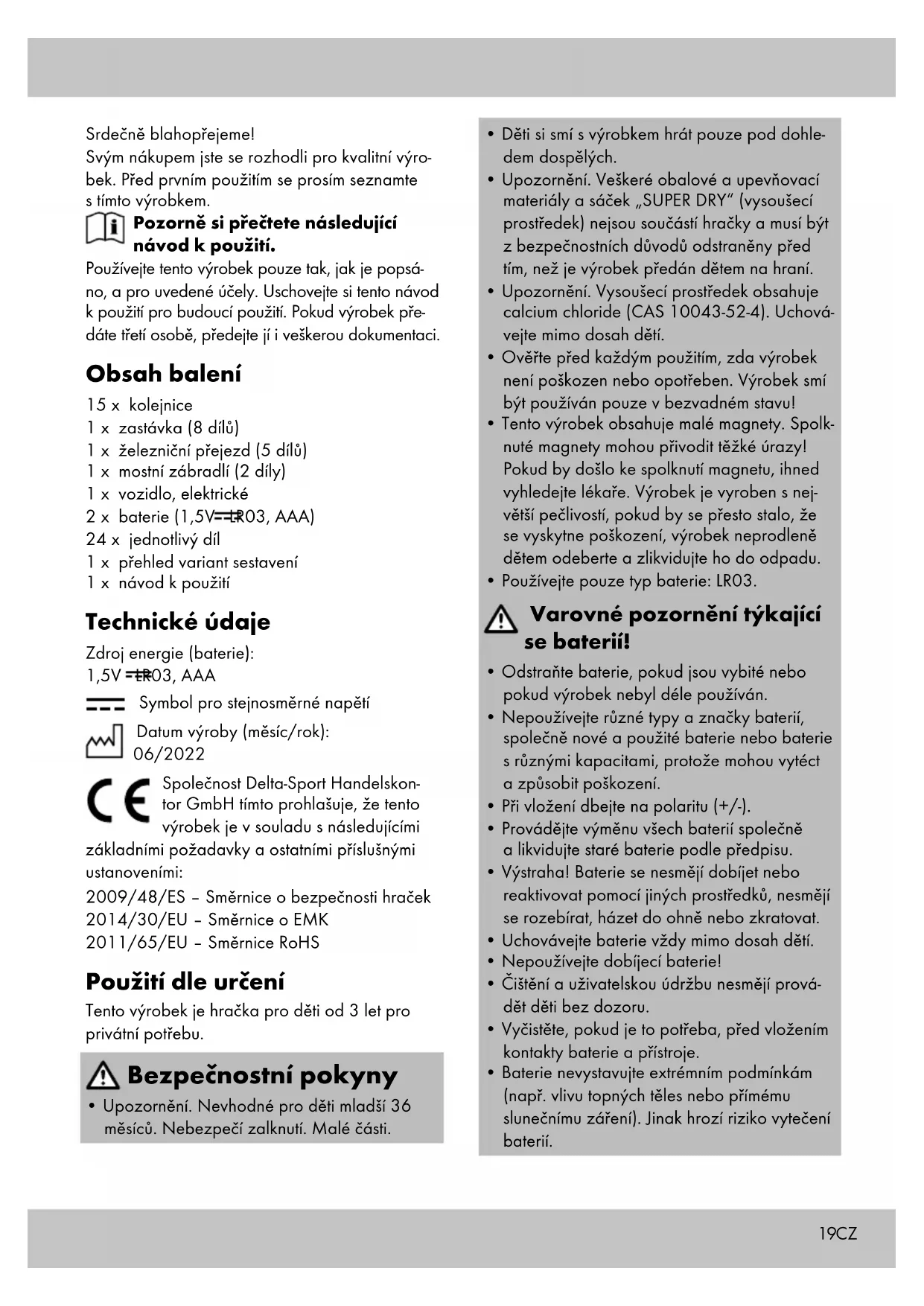 Symbol pro stejnosměrné napětí Datum výroby (měsíc/rok): 06/2022 Společnost Delta-Sport Handelskon- tor GmbH tímto prohlašuje, že tento výrobek je v souladu s následujícími základními požadavky a ostatními příslušnými ustanoveními: 2009/48/ES – Směrnice o bezpečnosti hraček 2014/30/EU – Směrnice o EMK 2011/65/EU – Směrnice RoHS Použití dle určení Tento výrobek je hračka pro děti od 3 let pro privátní potřebu. Bezpečnostní pokyny