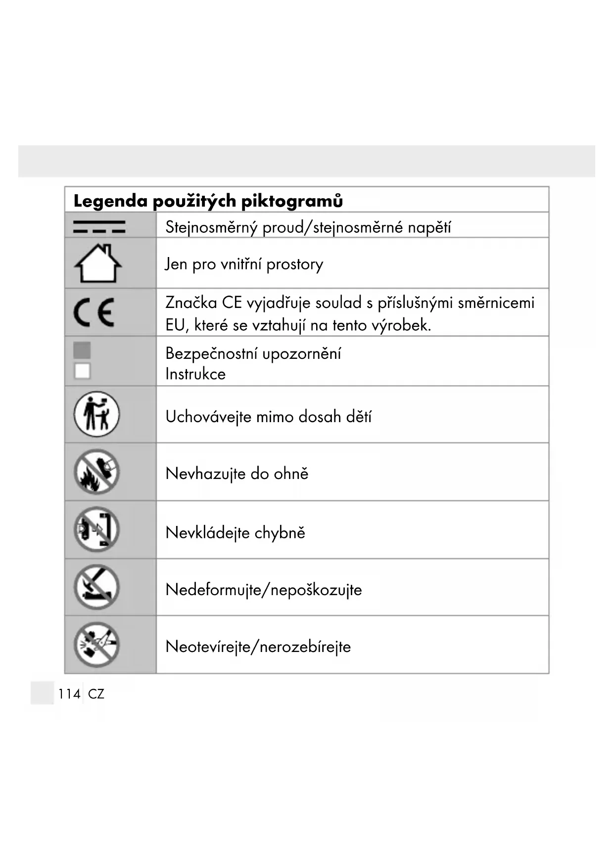BATERIE, KTERÉ LZE SPOLKNOUT! NEBEZPEČÍ UDUŠENÍ! Tento výrobek obsahuje mincovou/knoflíkovou baterii. Mincová/knoflíková baterie může při spolknutí způsobit vážné vnitřní chemické popáleniny nebo smrt. Vybité baterie ihned zlikvidujte. Uchovávejte nové i použité baterie mimo dosah dětí. Pokud se domníváte, že došlo ke spolknutí baterie nebo kjejímu vniknutí do některé části těla, okamžitě vyhledejte lékaře.122 CZ Bezpečnostní pokyny pro baterie a akumulátory UCHOVÁVEJTE BATERIE MIMO DOSAH DĚTÍ! Spolknutí může způsobit poleptání, proděravění měkkých tkání a smrt. K těžkým popáleninám může dojít během 2 hodin po spolknutí. Ihned vyhledat lékaře. NEBEZPEČÍ OHROŽENÍ ŽIVOTA! Uchovávejte baterie a akumulátory mimo dosah dětí. V případě spolknutí okamžitě vyhledejte lékařskou pomoc! Při požití může dojít k popáleninám, perforaci měkkých tkání a úmrtí. K závažným popáleninám může dojít do 2 hodin po požití. NEBEZPEČÍ VÝBUCHU! Nenabíjecí baterie nikdy znovu nenabíjejte. Baterie nebo akumulátory nezkra- tujte ani je neotevírejte. Hrozí přehřátí, nebezpečí po- žáru nebo jejich prasknutí. Nikdy neházejte baterie nebo akumulátory do ohně ani do vody. Nevystavujte baterie nebo akumulátory mechanickému zatížení.123 CZ Nebezpečí vytečení baterií/akumulátorů Zabraňte extrémním podmínkám a teplotám, např. na topení anebo na slunci, které mohou negativně ovlivnit funkci baterií nebo akumulátorů. V případě vytečení baterií/akumulátorů zabraňte kontaktu chemikálií s pokožkou, očima a sliznicemi! Omyjte ihned postižená místa dostatečným množstvím čisté vody a vyhledejte lékařskou pomoc! NOSTE OCHRANNÉ RUKAVICE! Vyteklé i poškozené baterie nebo akumulátory mohou při kontaktu s pokožkou způsobit její poleptání. Noste proto vhodné rukavice. V případě vytečení ihned odstraňte baterie nebo akumulátory z výrobku, abyste zabránili jeho poškození! Používejte jen baterie nebo akumulátory stejného typu. Nekombi- nujte staré baterie nebo akumulátory s novými! Odstraňte baterie nebo akumulátory při delším nepoužívání z vý- robku. Nebezpečí poškození výrobku Používejte jen udaný typ baterie nebo akumulátoru! Nasazujte baterie nebo akumulátory podle označení polarity (+) a (-) na bateriích nebo akumulátorech a na výrobku.124 CZ Vyčistěte kontakty na baterii/akumulátoru a v přihrádce na baterie před jejich vložením suchou utěrkou, která nepouští vlákna, nebo vatovým tamponem! Vybité baterie nebo akumulátory ihned vyjměte z výrobku. Symptomy, které mohou nastat při spolknutí baterie, nejsou zjevné Zda se knoflíková nebo mincová baterie nachází vtrávicím traktu dí- těte žel není patrné. Neexistují totiž žádné specifické symptomy, které by stím byly spojeny. Dítě by ale mohlo mít tyto symptomy: