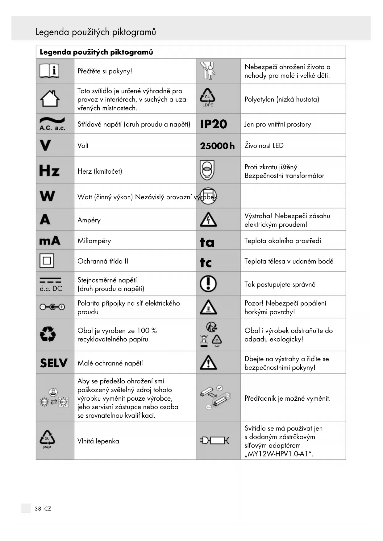 PAP Obal i výrobek odstraňujte do odpadu ekologicky! SELV Malé ochranné napětí Dbejte na výstrahy a řiďte se bezpečnostními pokyny! Aby se předešlo ohrožení smí poškozený světelný zdroj tohoto výrobku vyměnit pouze výrobce, jeho servisní zástupce nebo osoba se srovnatelnou kvalifikací. Předřadník je možné vyměnit.