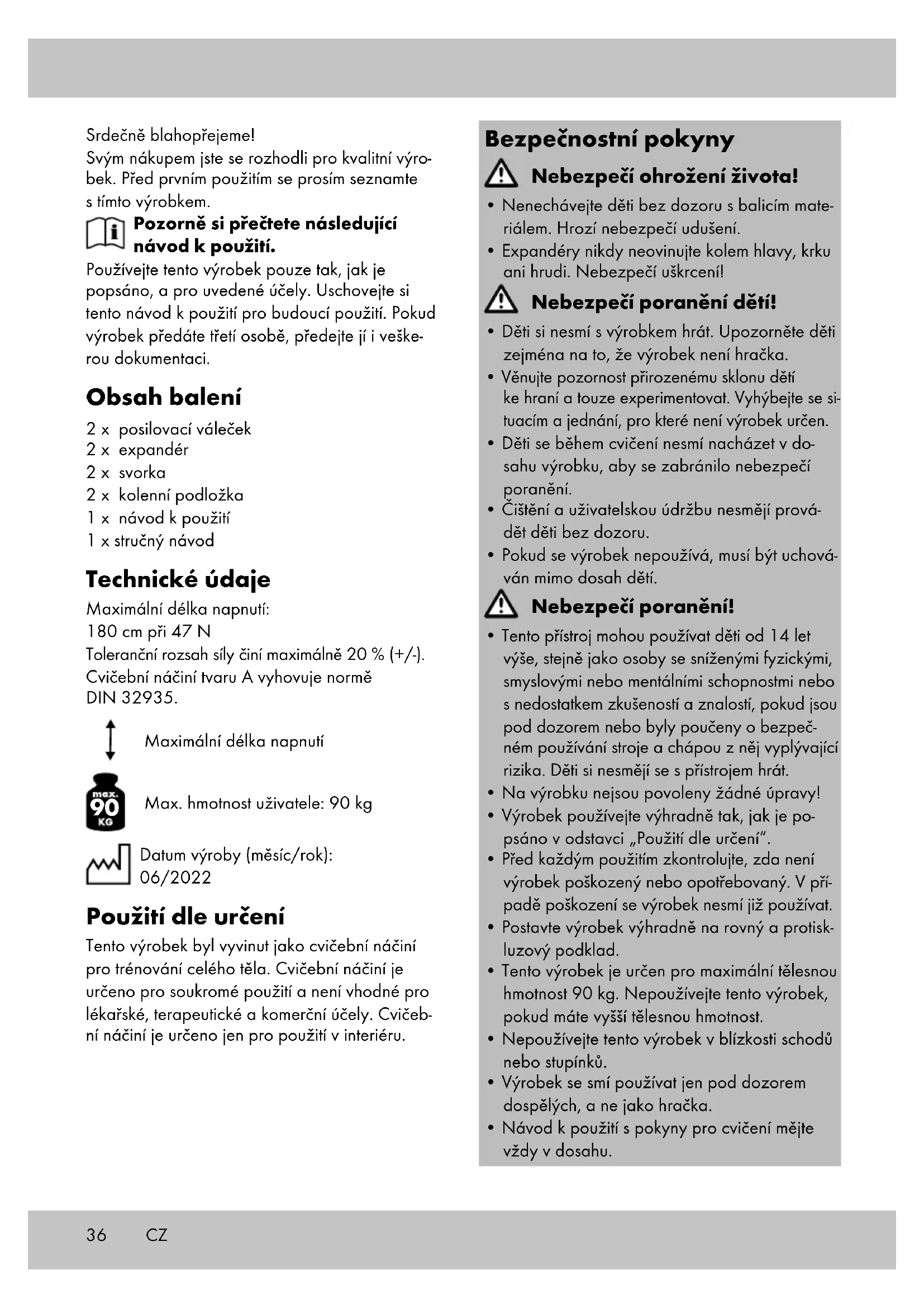 Max. hmotnost uživatele: 90 kg Datum výroby (měsíc/rok): 06/2022 Použití dle určení Tento výrobek byl vyvinut jako cvičební náčiní pro trénování celého těla. Cvičební náčiní je určeno pro soukromé použití a není vhodné pro lékařské, terapeutické a komerční účely. Cvičeb- ní náčiní je určeno jen pro použití v interiéru. Bezpečnostní pokyny Nebezpečí ohrožení života!