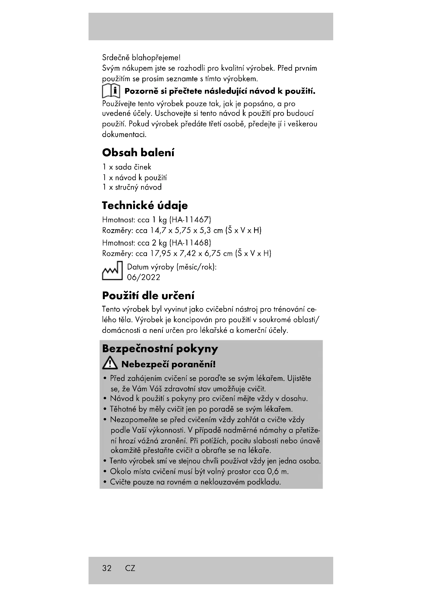 Důležité: Dbejte na to, abyste měli stehna rovnoběž- ně. Pánev přitom vysuňte dopředu, horní část těla zůstává vzpřímená. Uskladnění, čištění Pokud výrobek nepoužíváte, skladujte jej vždy suchý a čistý při pokojové teplotě. Čistěte pouze vlhkým hadříkem a následně otřete do sucha. DŮLEŽITÉ! K čištění nikdy nepoužívejte agresivní čisticí prostředky. Pokyny k likvidaci Výrobek a obalový materiál likvidujte do odpadu podle aktu- álních místních předpisů. Obalový materiál, jako např. fóliové sáčky, nepatří do dětských rukou. Obalový materiál uchovávejte z dosahu dětí. CZ35 Zlikvidujte produkty a balení ekologicky. Recyklační kód identifikuje různé materiály pro recyklaci. Kód se skládá z recyklačního symbolu - který indikuje recyklační cyklus - a čísla identifikujícího materiál. Pokyny k záruce a průběhu služby Výrobek byl vyroben s velkou péčí a za stálé kontroly. DELTA-SPORT HANDELSKONTOR GmbH poskytuje koncovým privátním zákazníkům na tento výrobek tři roky záruky od data nákupu (záruční lhůta) podle následující ustanovení. Záruka se týká pouze vad materiálu a závad ve zpracování. Záruka se ne- vztahuje na díly, které podléhají normálnímu opotřebení, a proto je nutné na ně pohlížet jako na rychle opotřebitelné díly (např. baterie), a na křehké díly, např. vypínače, akumulátory nebo díly vyrobené ze skla. Nároky z této záruky jsou vyloučeny, pokud výrobek byl pou- žíván neodborně nebo nedovoleným způsobem nebo nikoli v rámci stanoveného účelu určení nebo předpokládaného rozsahu používání nebo nebyla dodržena zadání v návodu k obsluze, le- daže by koncový zákazník prokázal, že existuje vada materiálu nebo došlo k chybě ve zpracování, které nevyplývají z některé výše uvedených okolností. Nároky ze záruky lze uplatnit pouze v rámci záruční lhůty po předložení originálního pokladního dokladu. Proto si prosím uschovejte originál pokladního dokladu. Doba záruky se nepro- dlužuje případnými opravami na základě záruky, zákonné záru- ky nebo kulance. Totéž platí také pro vyměněné a opravené díly. Při reklamacích se prosím obracejte na níže uvedenou horkou linku servisu nebo se s námi spojte e-mailem. Pokud se vyskytne případ reklamace, výrobek Vám – dle naší volby – bezplatně opravíme, vyměníme nebo Vám vrátíme kupní cenu. Další práva ze záruky nevznikají. Vaše zákonná práva, zejména nároky na zajištění záruky vůči konkrétnímu prodejci, nejsou touto zárukou omezena. IAN: 391390_2201 Servis Česko Tel.: 800143873 E-Mail: deltasport@lidl.cz CZ36 Blahoželáme! Svojím nákupom ste sa rozhodli pre kvalitný výrobok. Pred prvým použitím sa s výrobkom dôkladne oboznámte. Pozorne si prečítajte tento návod na použivanie. Výrobok používajte len uvedeným spôsobom a na uvedený účel. Tento návod na použivanie si dobre uschovajte. Pri odovzdávaní výrobku tretej osobe odovzdajte s výrobkom aj všetky podklady. Rozsah dodávky 1 x krátkych činiek 1 x návod na používanie 1 x krátky návod Technické údaje Hmotnosť: cca 1 kg (HA-11467) Rozmery: cca 14,7 x 5,75 x 5,3 cm (š x v x h) Hmotnosť: cca 2 kg (HA-11468) Rozmery: cca 17,95 x 7,42 x 6,75 cm (š x v x h) Dátum výroby (mesiac/rok): 06/2022 Určené použitie Tento výrobok bol vyvinutý ako tréningový nástroj, s ktorým môžete trénovať celé svoje telo. Tento výrobok je určený na po- užitie v súkromnej oblasti/doma a nie je vhodný na medicínske a komerčné účely. Bezpečnostné pokyny Nebezpečenstvo poranenia!
