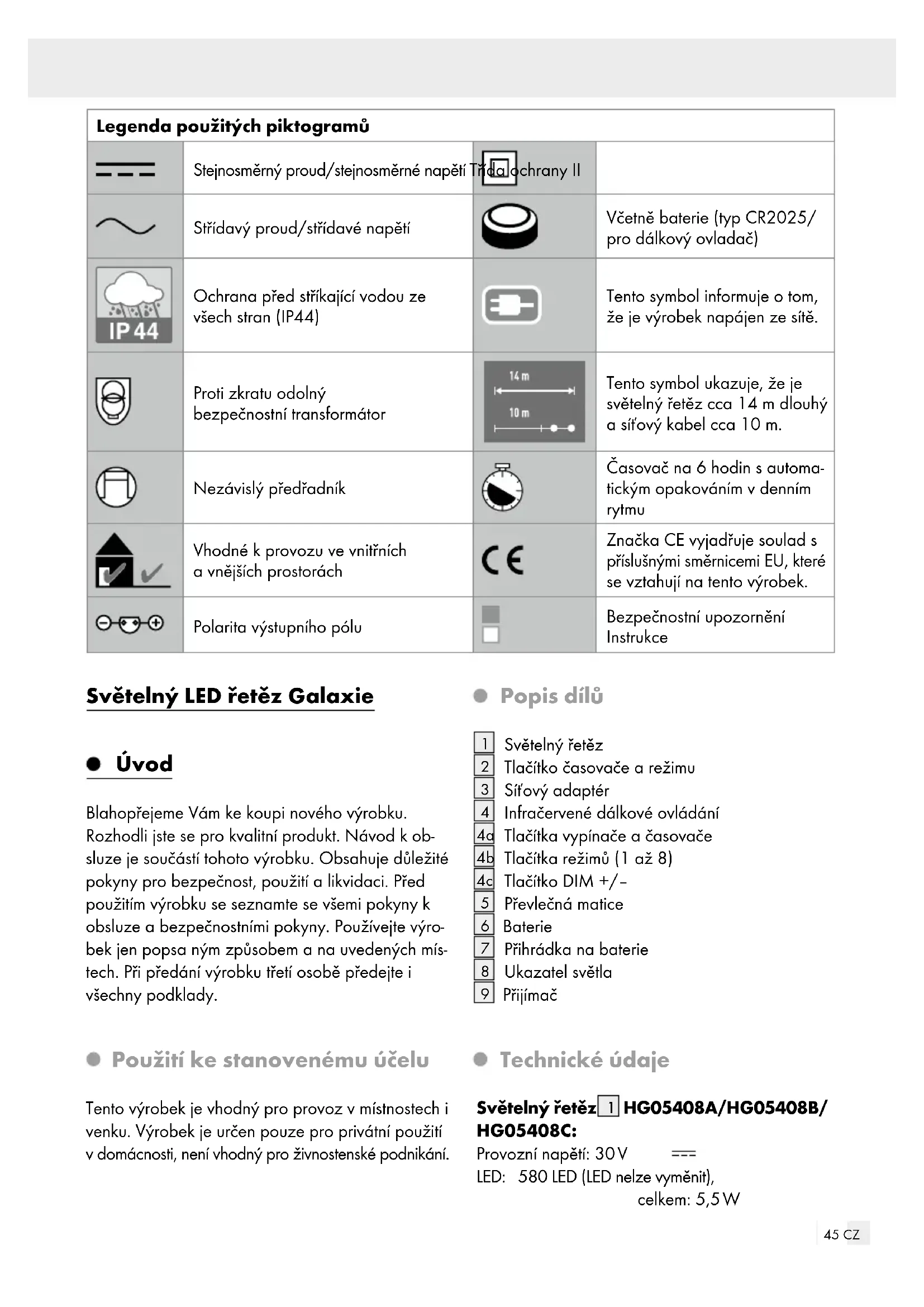 | Proti zkratu odolný bezpečnostní transformátó | Tento symbol ukazuje, ze je světelnéřetěz cca 14 m dlouhý a sítový kabel cca 10 m. | ||