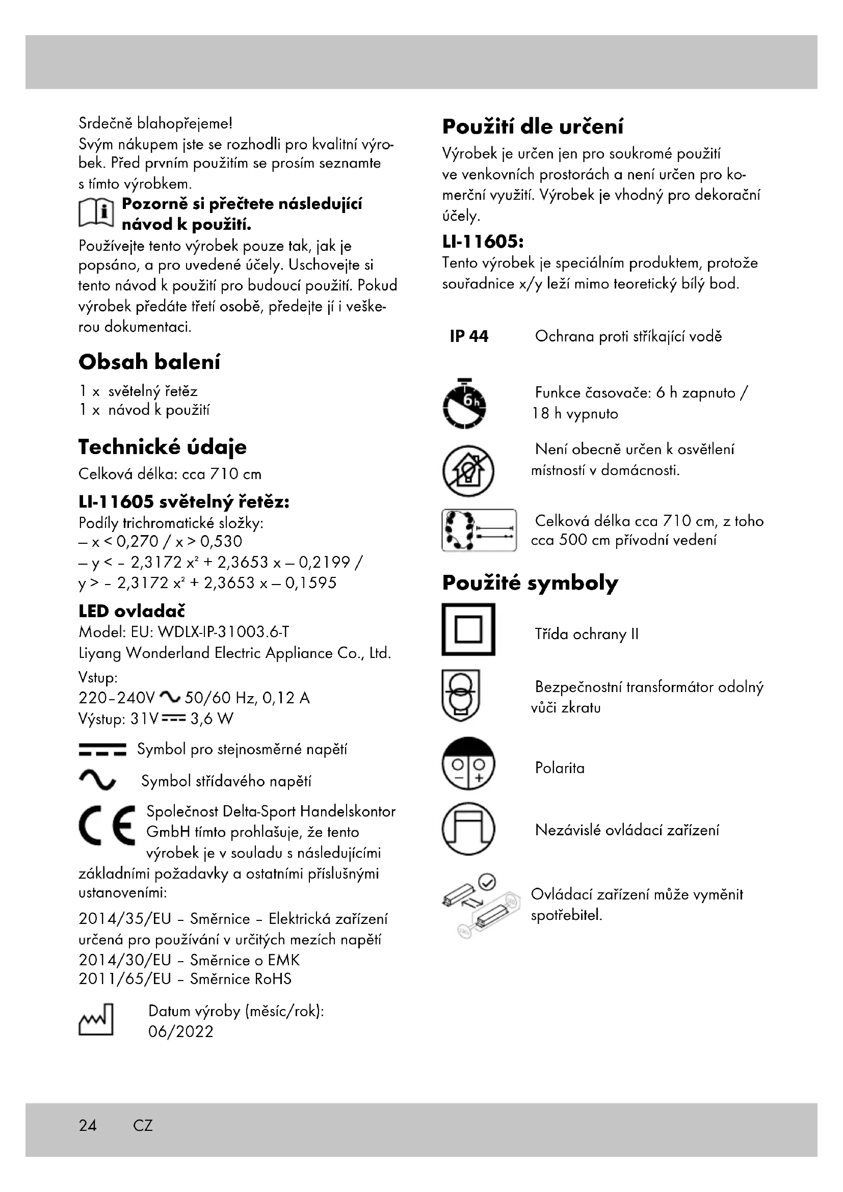 Możliwość ściemniania źródeł światła Układ sterowania nie nadaje się do ściemniania źródeł światła Zewnętrzne wymiary układu sterowania Model: EU: WDLX-IP-31003.6-T – 102 x 41 x 41 mm Model BS WDLX- 31003.6-T – 106 x 49 x 46 mm Waga układu sterowania Model: EU: WDLX-IP-31003.6-T: 50 g Model BS WDLX- 31003.6-T: 56 g Usuwanie układu sterowania z produktu Wyciągnąć układ sterowania z gniazdka sieciowego i odłączyć od artykułu Możliwość kompatybilności ściemnianych źródeł światła Układ sterowania nie nadaje się do ściemniania źródeł światła PL24 Srdečně blahopřejeme! Svým nákupem jste se rozhodli pro kvalitní výro- bek. Před prvním použitím se prosím seznamte s tímto výrobkem. Pozorně si přečtete následující návod k použití. Používejte tento výrobek pouze tak, jak je popsáno, a pro uvedené účely. Uschovejte si tento návod k použití pro budoucí použití. Pokud výrobek předáte třetí osobě, předejte jí i veške- rou dokumentaci. Obsah balení 1 x světelný řetěz 1 x návod k použití Technické údaje Celková délka: cca 710 cm LI-11605 světelný řetěz: Podíly trichromatické složky: — x < 0,270 / x > 0,530 — y < – 2,3172 x + 2,3653 x — 0,2199 / y > – 2,3172 x + 2,3653 x — 0,1595 LED ovladač Model: EU: WDLX-IP-31003.6-T Liyang Wonderland Electric Appliance Co., Ltd. Vstup: 220–240V 50/60 Hz, 0,12 A Výstup: 31V 3,6 W Symbol pro stejnosměrné napětí Symbol střídavého napětí Společnost Delta-Sport Handelskontor GmbH tímto prohlašuje, že tento výrobek je v souladu s následujícími základními požadavky a ostatními příslušnými ustanoveními: 2014/35/EU – Směrnice – Elektrická zařízení určená pro používání v určitých mezích napětí 2014/30/EU – Směrnice o EMK 2011/65/EU – Směrnice RoHS Datum výroby (měsíc/rok): 06/2022 Použití dle určení Výrobek je určen jen pro soukromé použití ve venkovních prostorách a není určen pro ko- merční využití. Výrobek je vhodný pro dekorační účely. LI-11605: Tento výrobek je speciálním produktem, protože souřadnice x/y leží mimo teoretický bílý bod. IP 44 Ochrana proti stříkající vodě Funkce časovače: 6 h zapnuto / 18 h vypnuto Není obecně určen k osvětlení místností v domácnosti. Celková délka cca 710 cm, z toho cca 500 cm přívodní vedení Použité symboly Třída ochrany II Bezpečnostní transformátor odolný vůči zkratu Polarita Nezávislé ovládací zařízení Ovládací zařízení může vyměnit spotřebitel. CZ25CZ Bezpečnostní pokyny Důležité: Přečtěte si pozorně návod k použití a uschovejte si jej! Nebezpečí ohrožení života!