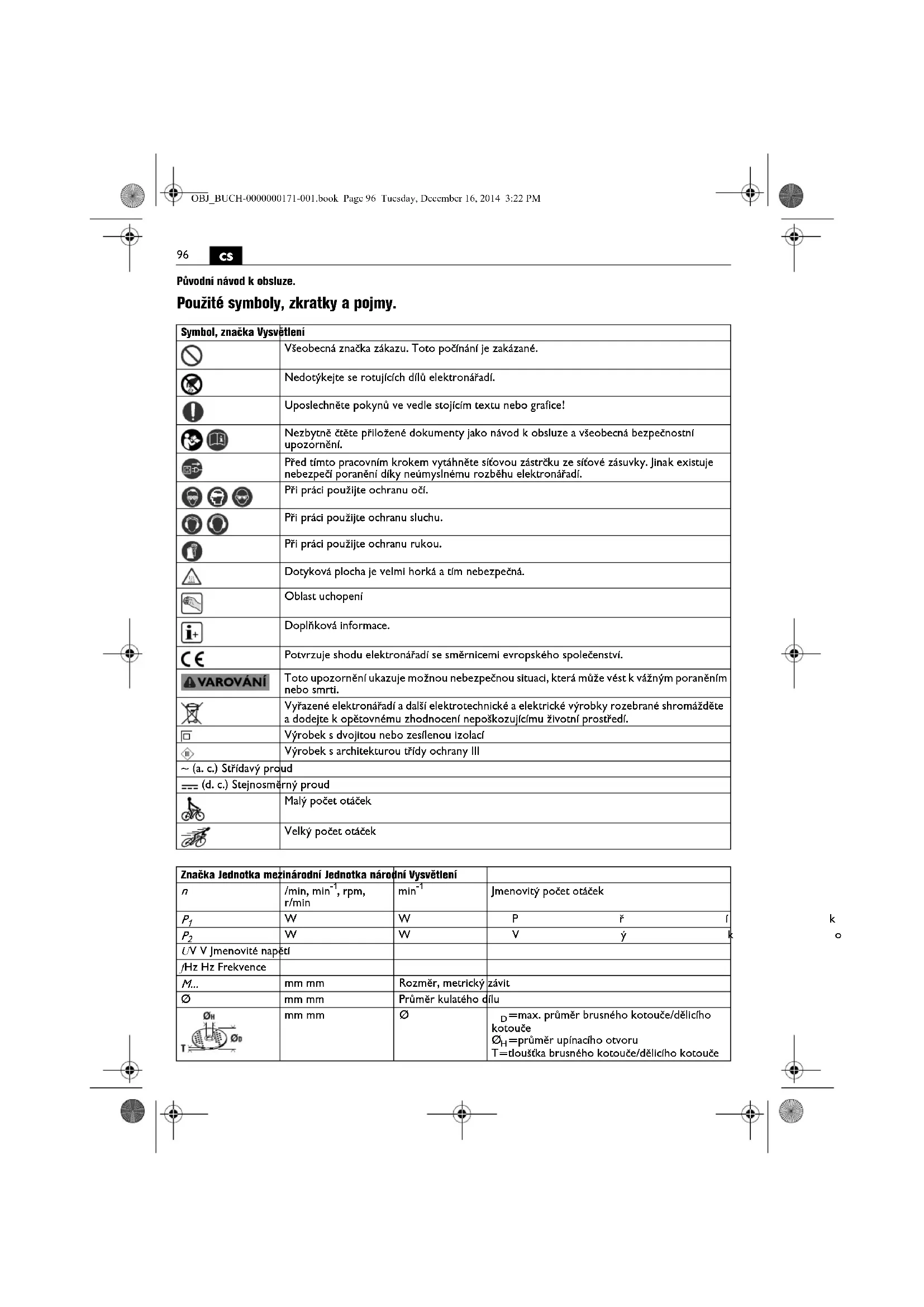 Původní návod k obsluze. Použité symboly, zkratky a pojmy. Symbol, značka Vysvětlení Všeobecná značka zákazu. Toto počínání je zakázané. Nedotýkejte se rotujících dílů elektronářadí. Uposlechněte pokynů ve vedle stojícím textu nebo grafice! Nezbytně čtěte přiložené dokumenty jako návod k obsluze a všeobecná bezpečnostní upozornění. Před tímto pracovním krokem vytáhněte síťovou zástrčku ze síťové zásuvky. Jinak existuje nebezpečí poranění díky neúmyslnému rozběhu elektronářadí. Při práci použijte ochranu očí. Při práci použijte ochranu sluchu. Při práci použijte ochranu rukou. Dotyková plocha je velmi horká a tím nebezpečná. Oblast uchopení Doplňková informace. Potvrzuje shodu elektronářadí se směrnicemi evropského společenství. Toto upozornění ukazuje možnou nebezpečnou situaci, která může vést k vážným poraněním nebo smrti. Vyřazené elektronářadí a další elektrotechnické a elektrické výrobky rozebrané shromážděte a dodejte k opětovnému zhodnocení nepoškozujícímu životní prostředí. Výrobek s dvojitou nebo zesílenou izolací Výrobek s architekturou třídy ochrany III ~ (a. c.) Střídavý proud (d. c.) Stejnosměrný proud Malý počet otáček Velký počet otáček Značka Jednotka mezinárodní Jednotka národní Vysvětlení