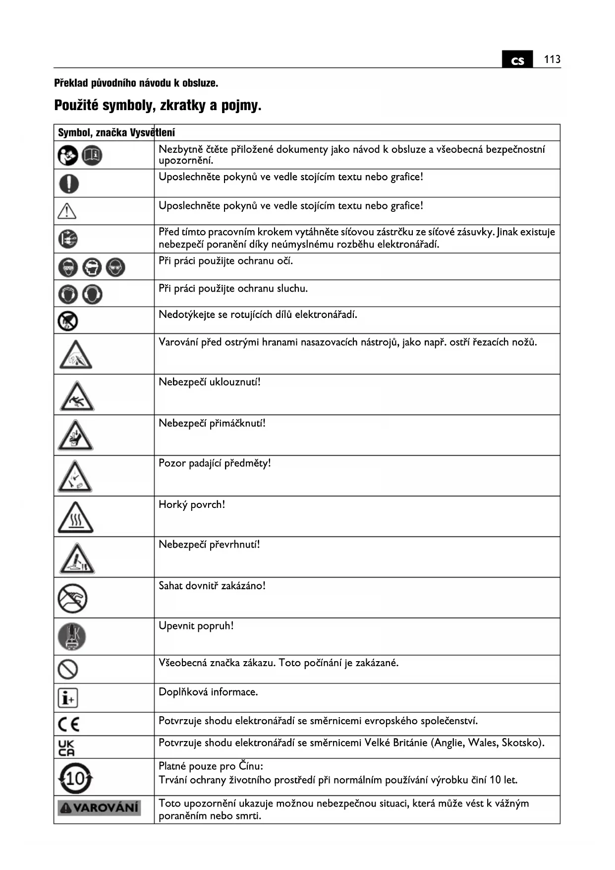 Překlad původního návodu k obsluze. Použité symboly, zkratky a pojmy. Symbol, značka Vysvětlení Nezbytně čtěte přiložené dokumenty jako návod k obsluze a všeobecná bezpečnostní upozornění. Uposlechněte pokynů ve vedle stojícím textu nebo grafice! Uposlechněte pokynů ve vedle stojícím textu nebo grafice! Před tímto pracovním krokem vytáhněte síťovou zástrčku ze síťové zásuvky. Jinak existuje nebezpečí poranění díky neúmyslnému rozběhu elektronářadí. Při práci použijte ochranu očí. Při práci použijte ochranu sluchu. Nedotýkejte se rotujících dílů elektronářadí. Varování před ostrými hranami nasazovacích nástrojů, jako např. ostří řezacích nožů. Nebezpečí uklouznutí! Nebezpečí přimáčknutí! Pozor padající předměty! Horký povrch! Nebezpečí převrhnutí! Sahat dovnitř zakázáno! Upevnit popruh! Všeobecná značka zákazu. Toto počínání je zakázané. Doplňková informace. Potvrzuje shodu elektronářadí se směrnicemi evropského společenství. Potvrzuje shodu elektronářadí se směrnicemi Velké Británie (Anglie, Wales, Skotsko). Platné pouze pro Čínu: Trvání ochrany životního prostředí při normálním používání výrobku činí 10 let. Toto upozornění ukazuje možnou nebezpečnou situaci, která může vést k vážným poraněním nebo smrti.114
