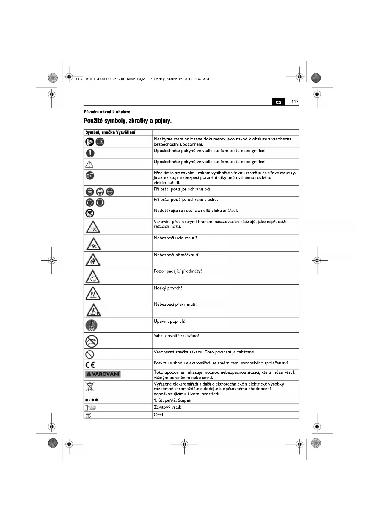 Původní návod k obsluze. Použité symboly, zkratky a pojmy. Symbol, značka Vysvětlení Nezbytně čtěte přiložené dokumenty jako návod k obsluze a všeobecná bezpečnostní upozornění. Uposlechněte pokynů ve vedle stojícím textu nebo grafice! Uposlechněte pokynů ve vedle stojícím textu nebo grafice! Před tímto pracovním krokem vytáhněte síťovou zástrčku ze síťové zásuvky. Jinak existuje nebezpečí poranění díky neúmyslnému rozběhu elektronářadí. Při práci použijte ochranu očí. Při práci použijte ochranu sluchu. Nedotýkejte se rotujících dílů elektronářadí. Varování před ostrými hranami nasazovacích nástrojů, jako např. ostří řezacích nožů. Nebezpečí uklouznutí! Nebezpečí přimáčknutí! Pozor padající předměty! Horký povrch! Nebezpečí převrhnutí! Upevnit popruh! Sahat dovnitř zakázáno! Všeobecná značka zákazu. Toto počínání je zakázané. Potvrzuje shodu elektronářadí se směrnicemi evropského společenství. Toto upozornění ukazuje možnou nebezpečnou situaci, která může vést k vážným poraněním nebo smrti. Vyřazené elektronářadí a další elektrotechnické a elektrické výrobky rozebrané shromážděte a dodejte k opětovnému zhodnocení nepoškozujícímu životní prostředí.