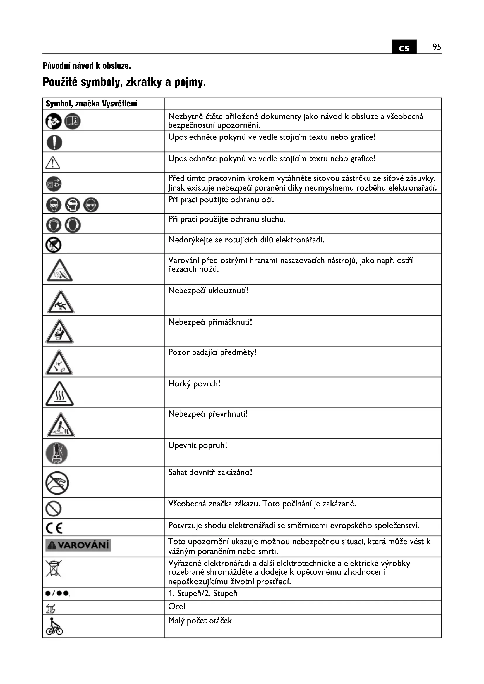Původní návod k obsluze. Použité symboly, zkratky a pojmy. Symbol, značka Vysvětlení Nezbytně čtěte přiložené dokumenty jako návod k obsluze a všeobecná bezpečnostní upozornění. Uposlechněte pokynů ve vedle stojícím textu nebo grafice! Uposlechněte pokynů ve vedle stojícím textu nebo grafice! Před tímto pracovním krokem vytáhněte síťovou zástrčku ze síťové zásuvky. Jinak existuje nebezpečí poranění díky neúmyslnému rozběhu elektronářadí. Při práci použijte ochranu očí. Při práci použijte ochranu sluchu. Nedotýkejte se rotujících dílů elektronářadí. Varování před ostrými hranami nasazovacích nástrojů, jako např. ostří řezacích nožů. Nebezpečí uklouznutí! Nebezpečí přimáčknutí! Pozor padající předměty! Horký povrch! Nebezpečí převrhnutí! Upevnit popruh! Sahat dovnitř zakázáno! Všeobecná značka zákazu. Toto počínání je zakázané. Potvrzuje shodu elektronářadí se směrnicemi evropského společenství. Toto upozornění ukazuje možnou nebezpečnou situaci, která může vést k vážným poraněním nebo smrti. Vyřazené elektronářadí a další elektrotechnické a elektrické výrobky rozebrané shromážděte a dodejte k opětovnému zhodnocení nepoškozujícímu životní prostředí.
