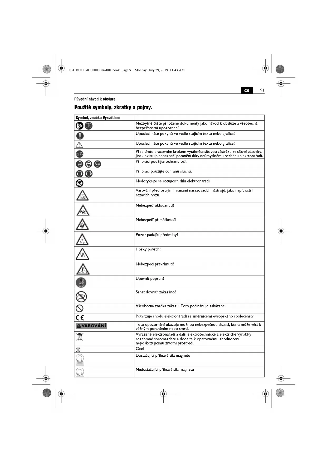 Původní návod k obsluze. Použité symboly, zkratky a pojmy. Symbol, značka Vysvětlení Nezbytně čtěte přiložené dokumenty jako návod k obsluze a všeobecná bezpečnostní upozornění. Uposlechněte pokynů ve vedle stojícím textu nebo grafice! Uposlechněte pokynů ve vedle stojícím textu nebo grafice! Před tímto pracovním krokem vytáhněte síťovou zástrčku ze síťové zásuvky. Jinak existuje nebezpečí poranění díky neúmyslnému rozběhu elektronářadí. Při práci použijte ochranu očí. Při práci použijte ochranu sluchu. Nedotýkejte se rotujících dílů elektronářadí. Varování před ostrými hranami nasazovacích nástrojů, jako např. ostří řezacích nožů. Nebezpečí uklouznutí! Nebezpečí přimáčknutí! Pozor padající předměty! Horký povrch! Nebezpečí převrhnutí! Upevnit popruh! Sahat dovnitř zakázáno! Všeobecná značka zákazu. Toto počínání je zakázané. Potvrzuje shodu elektronářadí se směrnicemi evropského společenství. Toto upozornění ukazuje možnou nebezpečnou situaci, která může vést k vážným poraněním nebo smrti. Vyřazené elektronářadí a další elektrotechnické a elektrické výrobky rozebrané shromážděte a dodejte k opětovnému zhodnocení nepoškozujícímu životní prostředí. Ocel Dostačující přilnavá síla magnetu Nedostačující přilnavá síla magnetu OBJ_BUCH-0000000386-001.book Page 91 Monday, July 29, 2019 11:43 AM92