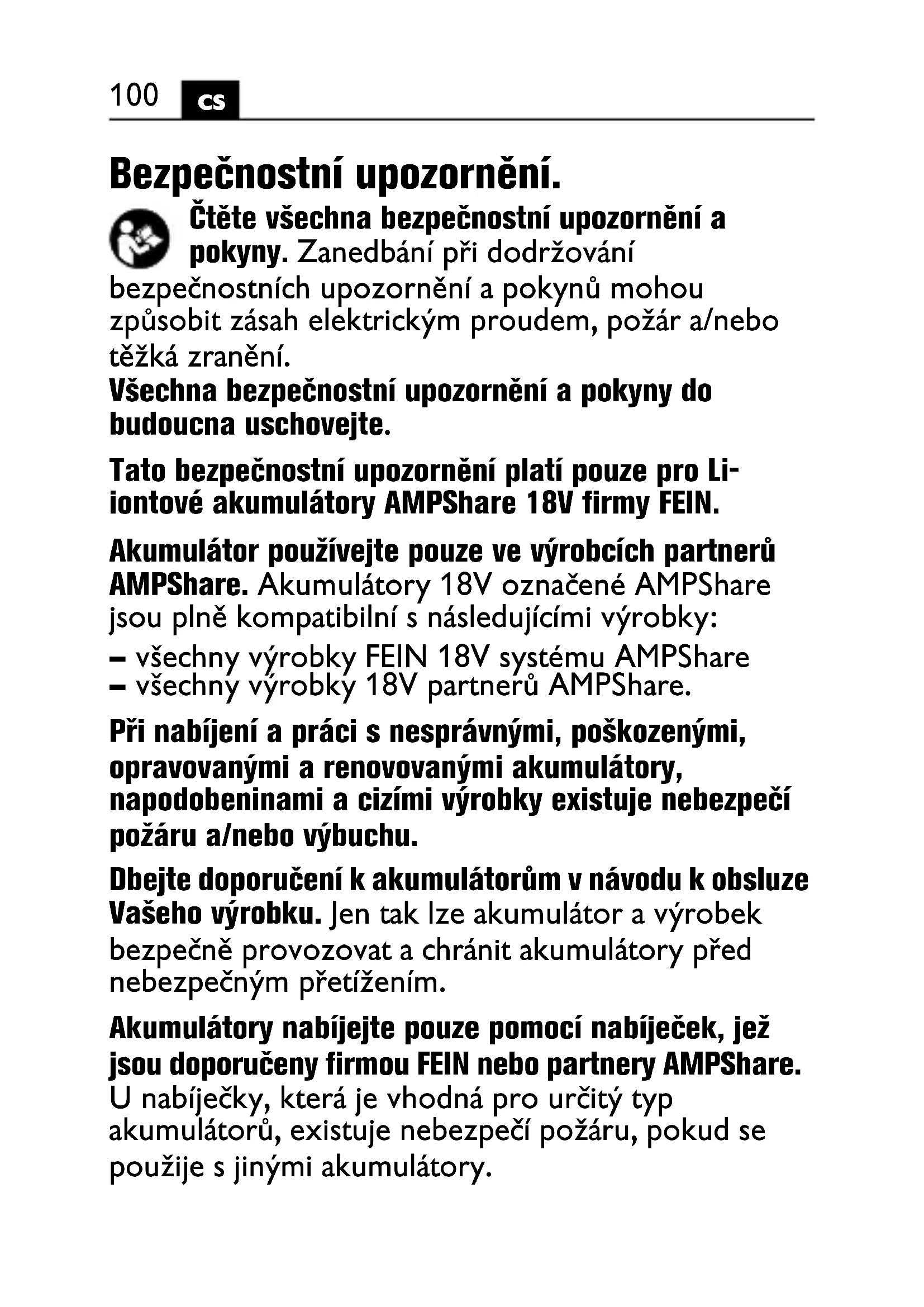 Bezpečnostní upozornění. Čtěte všechna bezpečnostní upozornění a pokyny. Zanedbání při dodržování bezpečnostních upozornění a pokynů mohou způsobit zásah elektrickým proudem, požár a/nebo těžká zranění. Všechna bezpečnostní upozornění a pokyny do budoucna uschovejte. Tato bezpečnostní upozornění platí pouze pro Li- iontové akumulátory AMPShare 18V firmy FEIN. Akumulátor používejte pouze ve výrobcích partnerů AMPShare. Akumulátory 18V označené AMPShare jsou plně kompatibilní s následujícími výrobky: – všechny výrobky FEIN 18V systému AMPShare – všechny výrobky 18V partnerů AMPShare. Při nabíjení a práci s nesprávnými, poškozenými, opravovanými a renovovanými akumulátory, napodobeninami a cizími výrobky existuje nebezpečí požáru a/nebo výbuchu. Dbejte doporučení k akumulátorům v návodu k obsluze Vašeho výrobku. Jen tak lze akumulátor a výrobek bezpečně provozovat a chránit akumulátory před nebezpečným přetížením. Akumulátory nabíjejte pouze pomocí nabíječek, jež jsou doporučeny firmou FEIN nebo partnery AMPShare. U nabíječky, která je vhodná pro určitý typ akumulátorů, existuje nebezpečí požáru, pokud se použije s jinými akumulátory.101