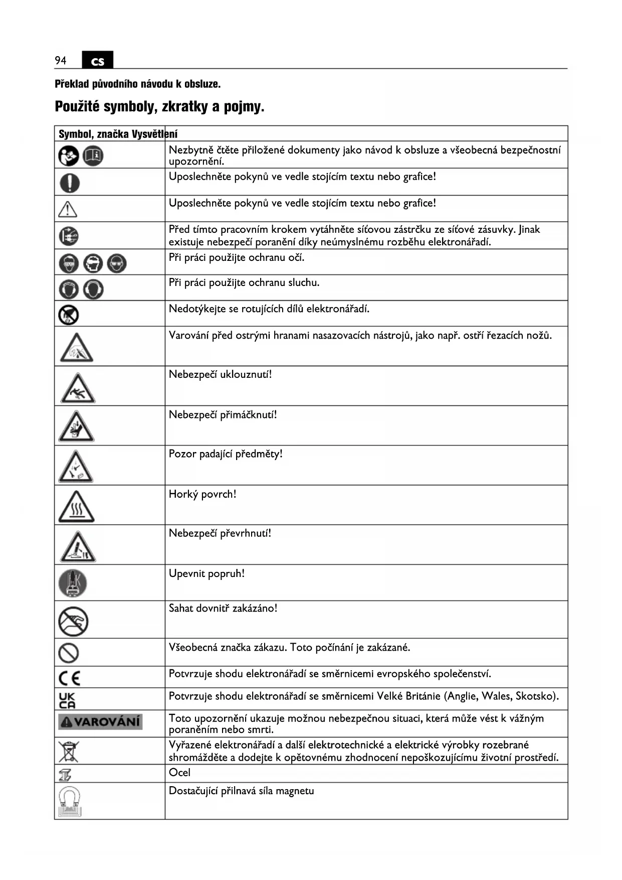 Překlad původního návodu k obsluze. Použité symboly, zkratky a pojmy. Symbol, značka Vysvětlení Nezbytně čtěte přiložené dokumenty jako návod k obsluze a všeobecná bezpečnostní upozornění. Uposlechněte pokynů ve vedle stojícím textu nebo grafice! Uposlechněte pokynů ve vedle stojícím textu nebo grafice! Před tímto pracovním krokem vytáhněte síťovou zástrčku ze síťové zásuvky. Jinak existuje nebezpečí poranění díky neúmyslnému rozběhu elektronářadí. Při práci použijte ochranu očí. Při práci použijte ochranu sluchu. Nedotýkejte se rotujících dílů elektronářadí. Varování před ostrými hranami nasazovacích nástrojů, jako např. ostří řezacích nožů. Nebezpečí uklouznutí! Nebezpečí přimáčknutí! Pozor padající předměty! Horký povrch! Nebezpečí převrhnutí! Upevnit popruh! Sahat dovnitř zakázáno! Všeobecná značka zákazu. Toto počínání je zakázané. Potvrzuje shodu elektronářadí se směrnicemi evropského společenství. Potvrzuje shodu elektronářadí se směrnicemi Velké Británie (Anglie, Wales, Skotsko). Toto upozornění ukazuje možnou nebezpečnou situaci, která může vést k vážným poraněním nebo smrti. Vyřazené elektronářadí a další elektrotechnické a elektrické výrobky rozebrané shromážděte a dodejte k opětovnému zhodnocení nepoškozujícímu životní prostředí. Ocel Dostačující přilnavá síla magnetu95