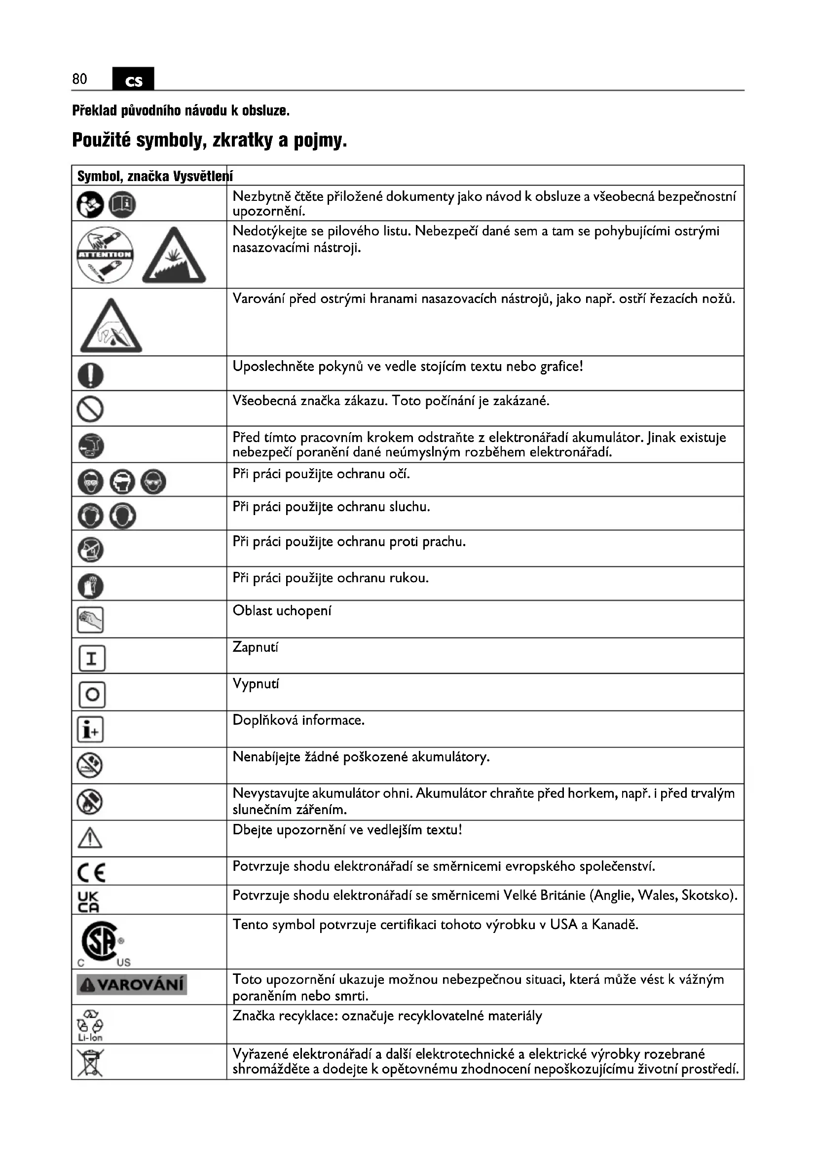 Překlad původního návodu k obsluze. Použité symboly, zkratky a pojmy. Symbol, značka Vysvětlení Nezbytně čtěte přiložené dokumenty jako návod k obsluze a všeobecná bezpečnostní upozornění. Nedotýkejte se pilového listu. Nebezpečí dané sem a tam se pohybujícími ostrými nasazovacími nástroji. Varování před ostrými hranami nasazovacích nástrojů, jako např. ostří řezacích nožů. Uposlechněte pokynů ve vedle stojícím textu nebo grafice! Všeobecná značka zákazu. Toto počínání je zakázané. Před tímto pracovním krokem odstraňte z elektronářadí akumulátor. Jinak existuje nebezpečí poranění dané neúmyslným rozběhem elektronářadí. Při práci použijte ochranu očí. Při práci použijte ochranu sluchu. Při práci použijte ochranu proti prachu. Při práci použijte ochranu rukou. Oblast uchopení Zapnutí Vypnutí Doplňková informace. Nenabíjejte žádné poškozené akumulátory. Nevystavujte akumulátor ohni. Akumulátor chraňte před horkem, např. i před trvalým slunečním zářením. Dbejte upozornění ve vedlejším textu! Potvrzuje shodu elektronářadí se směrnicemi evropského společenství. Potvrzuje shodu elektronářadí se směrnicemi Velké Británie (Anglie, Wales, Skotsko). Tento symbol potvrzuje certifikaci tohoto výrobku v USA a Kanadě. Toto upozornění ukazuje možnou nebezpečnou situaci, která může vést k vážným poraněním nebo smrti. Značka recyklace: označuje recyklovatelné materiály Vyřazené elektronářadí a další elektrotechnické a elektrické výrobky rozebrané shromážděte a dodejte k opětovnému zhodnocení nepoškozujícímu životní prostředí.81
