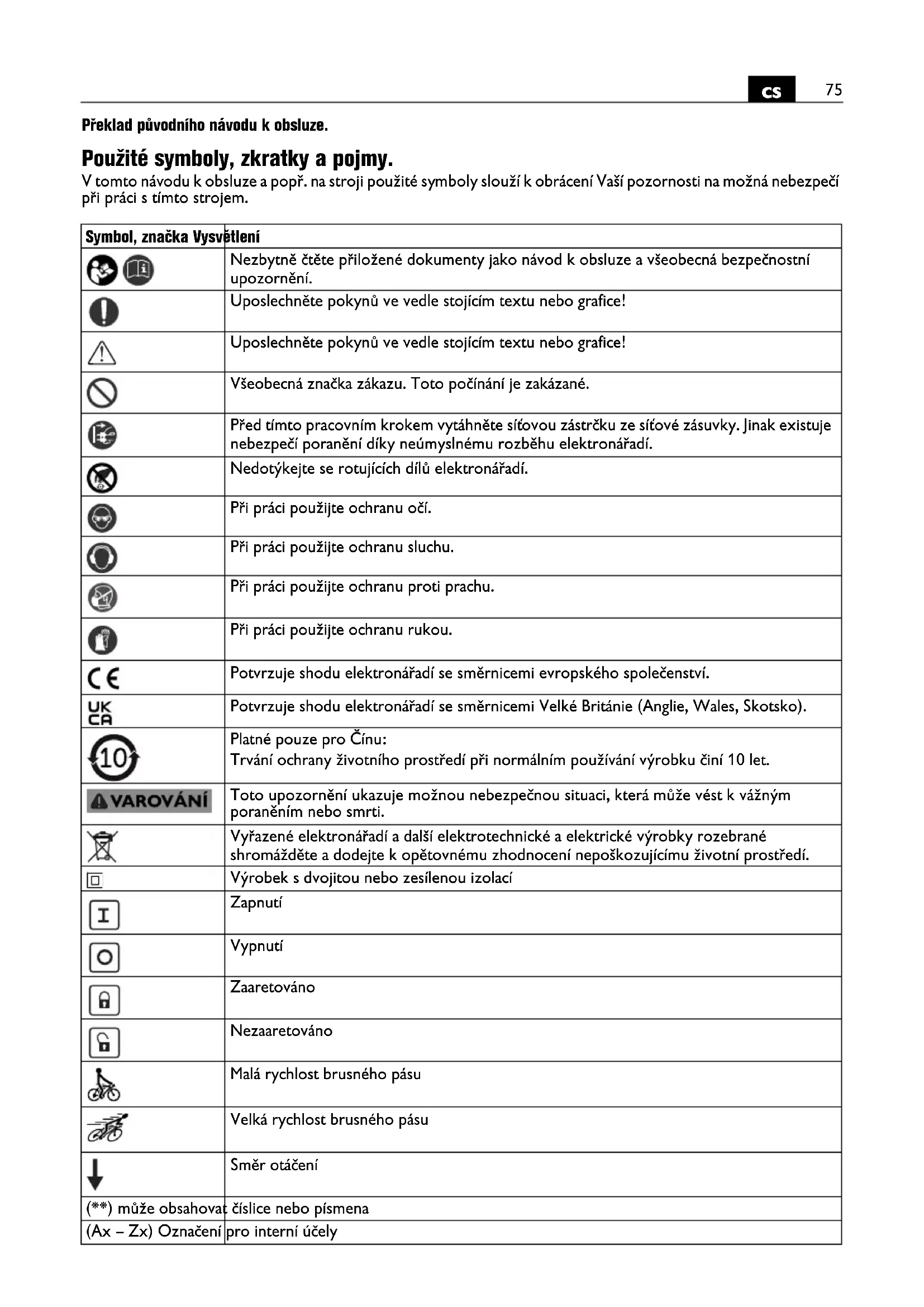 Pro Vaši bezpečnost. Čtěte všechna varovná upozornění a pokyny. Zanedbání při dodržování varovných upozornění a pokynů mohou mít za následek zásah elektrickým proudem, požár a/nebo těžká poranění. Všechna varovná upozornění a pokyny do budoucna uschovejte. Toto elektronářadí nepoužívejte, dokud jste si důkladně nepřečetli a zcela neporozuměli tomuto návodu k obsluze a též přiloženým „Všeobecným bezpečnostním upozorněním“ (číslo spisu 3 41 30 465 06 0). Uchovejte uvedené podklady k pozdějšímu použití a předejte je při zapůjčení nebo prodeji elektronářadí. Dbejte rovněž příslušných národních ustanovení ochrany při práci. Určené použití, limity použití: Ruční pásová bruska pro broušení za sucha brusnými pásy a leštění kovových povrchů pomocí firmou Fein schválených pracovních nástrojů a příslušenství v prostředí chráněném před povětrnostními vlivy. Použití pouze na stabilním podkladu. Elektronářadí je určeno k obsluze odborným personálem a nikoli pro trvalé každodenní nasazení. Pásová bruska není určena pro opracování dřeva, minerálních materiálů, umělých hmot, hořčíku a materiálů vyztužených vlákny (např. uhlíkovými/skleněnými). V rušivém prostředí je možné snížení kvality provozu, jako dočasný výpadek, dočasné omezení funkce nebo určeného provozního chování, pro jehož odstranění je zapotřebí zásah obsluhující osoby. Toto elektronářadí je zamýšleno i pro používání na generátorech střídavého proudu s dostatečným výkonem, jež vyhovují normě ISO 8528, třída provedení G2. Této normě nevyhovují zejména tehdy, když takzvaný činitel harmonického zkreslení překračuje 10 %. Při pochybnosti se na Vámi používaný generátor informujte. Speciální bezpečnostní předpisy. Držte elektronářadí na izolovaných uchopovacích plochách, poněvadž brusná plocha může zasáhnout vlastní sítový kabel. Poškození el. vedení pod napětím může přivést napětí na kovové díly zařízení a vést k zásahu elektrickým proudem. Další bezpečnostní upozornění Noste osobní ochranné vybavení. Podle aplikace použijte ochranu celého obličeje, ochranu očí nebo ochranné brýle. Taktéž adekvátně noste ochrannou masku proti prachu, ochranu sluchu, ochranné rukavice nebo speciální zástěru, jež Vás ochrání před malými částicemi brusiva a materiálu. Oči mají být chráněny před odletujícími cizími tělísky, jež vznikají při různých aplikacích. Protiprachová maska či respirátor musejí při používání vznikající prach odfiltrovat. Pokud jste dlouho vystaveni silnému hluku, můžete utrpět ztrátu sluchu. Při práci nenoste žádný volný oděv, šperky nebo volné, dlouhé vlasy. Volné předměty mohou být i přes ochranné přípravky zachyceny pohybujícími se díly a vést k poraněním. Nepoužívejte žádné opotřebované, zatržené nebo silně zanesené brusné pásy. Zacházejte s brusnými pásy pečlivě a uskladňujte je podle pokynů výrobce. Brusné pásy nelámejte! Poškozené brusné pásy se mohou roztrhnout, odmrštit a někoho zranit. Značka Jednotka mezinárodní Jednotka národní Vysvětlení