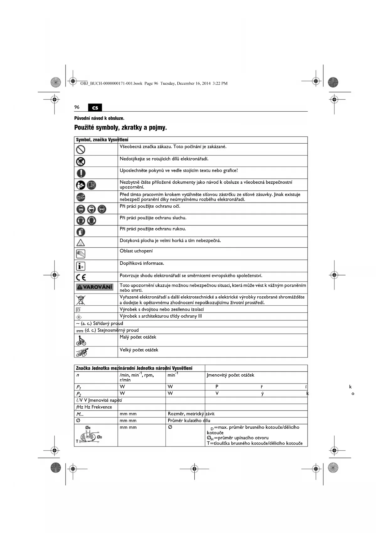 Původní návod k obsluze. Použité symboly, zkratky a pojmy. Symbol, značka Vysvětlení Všeobecná značka zákazu. Toto počínání je zakázané. Nedotýkejte se rotujících dílů elektronářadí. Uposlechněte pokynů ve vedle stojícím textu nebo grafice! Nezbytně čtěte přiložené dokumenty jako návod k obsluze a všeobecná bezpečnostní upozornění. Před tímto pracovním krokem vytáhněte síťovou zástrčku ze síťové zásuvky. Jinak existuje nebezpečí poranění díky neúmyslnému rozběhu elektronářadí. Při práci použijte ochranu očí. Při práci použijte ochranu sluchu. Při práci použijte ochranu rukou. Dotyková plocha je velmi horká a tím nebezpečná. Oblast uchopení Doplňková informace. Potvrzuje shodu elektronářadí se směrnicemi evropského společenství. Toto upozornění ukazuje možnou nebezpečnou situaci, která může vést k vážným poraněním nebo smrti. Vyřazené elektronářadí a další elektrotechnické a elektrické výrobky rozebrané shromážděte a dodejte k opětovnému zhodnocení nepoškozujícímu životní prostředí. Výrobek s dvojitou nebo zesílenou izolací Výrobek s architekturou třídy ochrany III ~ (a. c.) Střídavý proud (d. c.) Stejnosměrný proud Malý počet otáček Velký počet otáček Značka Jednotka mezinárodní Jednotka národní Vysvětlení