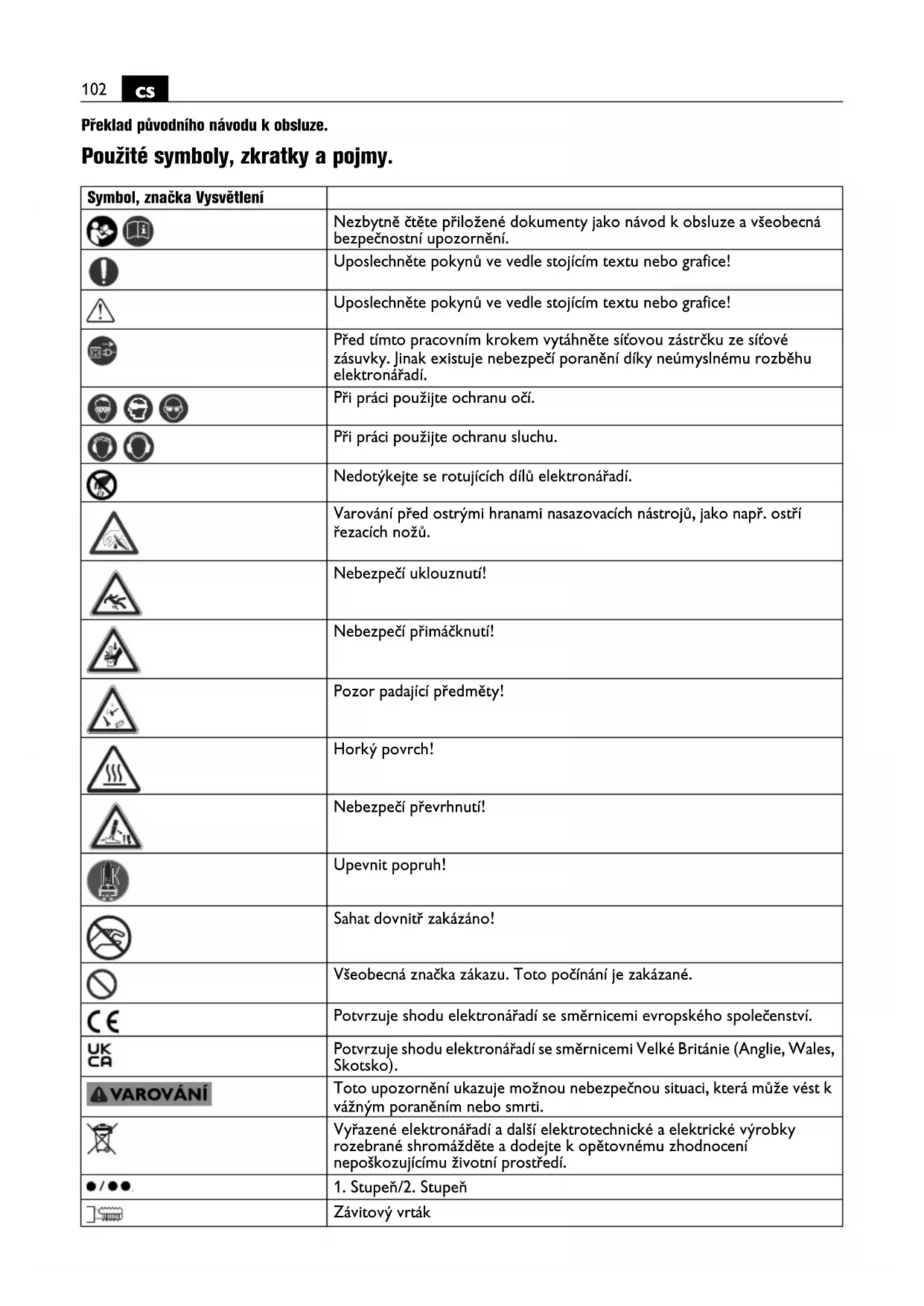 Překlad původního návodu k obsluze. Použité symboly, zkratky a pojmy. Symbol, značka Vysvětlení Nezbytně čtěte přiložené dokumenty jako návod k obsluze a všeobecná bezpečnostní upozornění. Uposlechněte pokynů ve vedle stojícím textu nebo grafice! Uposlechněte pokynů ve vedle stojícím textu nebo grafice! Před tímto pracovním krokem vytáhněte síťovou zástrčku ze síťové zásuvky. Jinak existuje nebezpečí poranění díky neúmyslnému rozběhu elektronářadí. Při práci použijte ochranu očí. Při práci použijte ochranu sluchu. Nedotýkejte se rotujících dílů elektronářadí. Varování před ostrými hranami nasazovacích nástrojů, jako např. ostří řezacích nožů. Nebezpečí uklouznutí! Nebezpečí přimáčknutí! Pozor padající předměty! Horký povrch! Nebezpečí převrhnutí! Upevnit popruh! Sahat dovnitř zakázáno! Všeobecná značka zákazu. Toto počínání je zakázané. Potvrzuje shodu elektronářadí se směrnicemi evropského společenství. Potvrzuje shodu elektronářadí se směrnicemi Velké Británie (Anglie, Wales, Skotsko). Toto upozornění ukazuje možnou nebezpečnou situaci, která může vést k vážným poraněním nebo smrti. Vyřazené elektronářadí a další elektrotechnické a elektrické výrobky rozebrané shromážděte a dodejte k opětovnému zhodnocení nepoškozujícímu životní prostředí.