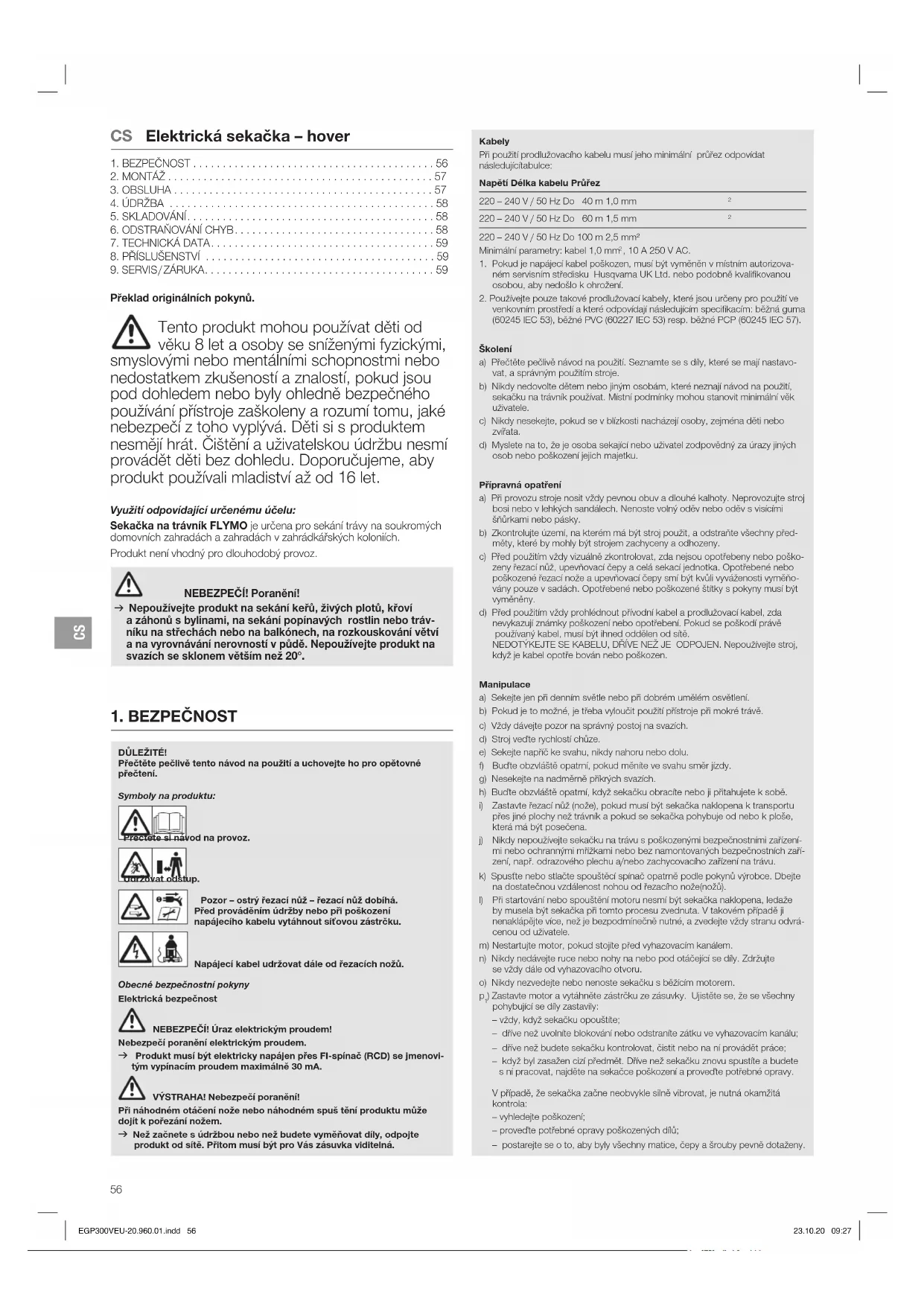 ) Zastavte motor a vytáhněte zástrčku ze zásuvky. Ujistěte se, že se všechny pohybující se díly zastavily: – vždy, když sekačku opouštíte; – dříve než uvolníte blokování nebo odstraníte zátku ve vyhazovacím kanálu; – dříve než budete sekačku kontrolovat, čistit nebo na ní provádět práce; – když byl zasažen cizí předmět. Dříve než sekačku znovu spustíte a budete s ní pracovat, najděte na sekačce poškození a proveďte potřebné opravy. V případě, že sekačka začne neobvykle silně vibrovat, je nutná okamžitá kontrola: – vyhledejte poškození; – proveďte potřebné opravy poškozených dílů; – postarejte se o to, aby byly všechny matice, čepy a šrouby pevně dotaženy. EGP300VEU-20.960.01.indd 56 23.10.20 09:27CS